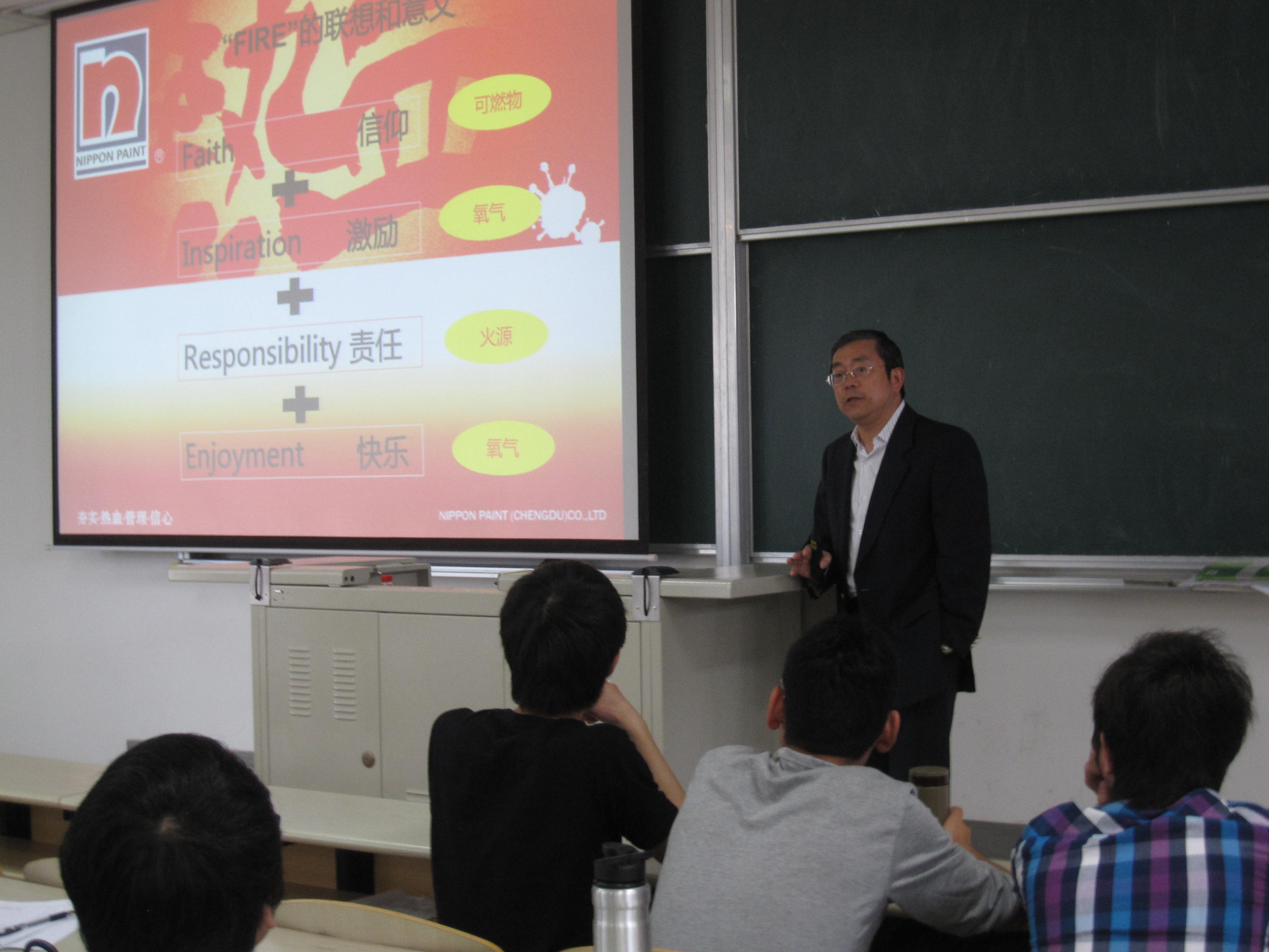 为引导学生更好地规划自己的大学生活和职业生涯,化学与分子工程学院邀请了立邦涂料(中国)人事行政总监钱国新先生在奉贤校区为做了题为“化学与漆彩生活”的讲座。钱国新总监首先由火、色彩、涂料引发联想,以“FIRE”展开讲座,从锦绣前程配方,人生路怎么走,以及我对职业生涯规划的看法为同学们诠释了职业生涯的成功路径。