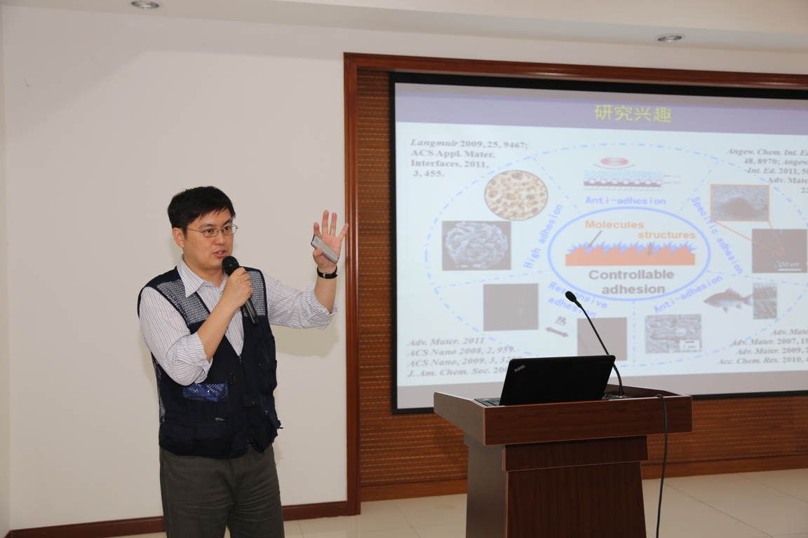 王树涛研究员围绕多尺度生物界面化学及界面粘附性质的调控过程,提出“结构识别与分子识别”协同的生物识别粘附效应。其研究以癌症早期诊断为导向,结合抗粘附界面材料和高效生物识别粘附器件,从检测人体血液中癌细胞入手,阐述了其科研团队近年来取得的一系列工作进展;并通过不同粘附界面的研究,提出了界面结构对细胞特异性的关系,进而构筑了一系列高校特异细胞黏附界面;利用外场分子的无损调控,实现了刺激响应界面对细胞特异粘附和去粘附的响应,为重大疾病的检测提供了新方法和新思路。