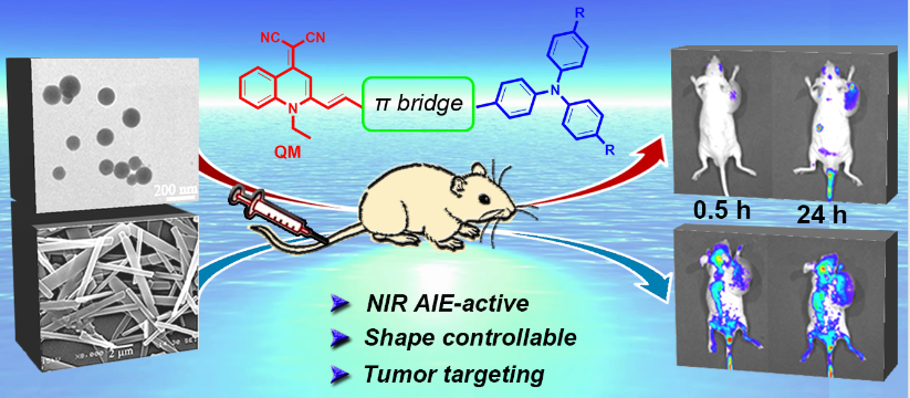 基于染料的荧光探针对疾病早期的变异进行靶向性识别和特异性诊断倍受关注。然而,传统的有机荧光小分子在生物成像应用中仍存在多种制约,如染料分子本身的聚集荧光淬灭现象,特别是对染料分子聚集态的荧光性能与生物靶向作用之间关联的缺乏认识。该研究基于课题组前期设计的聚集荧光增强型(AIE)喹啉腈染料母体单元,通过中间共轭桥连、给体单元的修饰进行近红外长波长和染料聚集形貌的调控,创新地合成了一系列具有生物靶向性能的近红外荧光染料分子,极大地克服了现有AIE类化合物短波长的缺陷。特别值得注意的是,该研究工作在荧光染料波长、分子的聚集形貌与生物靶向特性取得了很好突破,为发展高性能近红外染料分子作为活体成像应用中的纳米材料提供了一条新的设计思路。