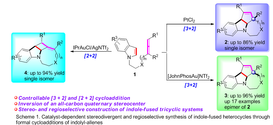 施敏教授课题组在自己所发展的金催化的炔丙醇酯环化反应(Angew. Chem. Int. Ed. 2011, 50, 2583)以及1,1-双吲哚-5-己炔的分子内环化(Angew. Chem. Int. Ed. 2013, 52, 6767)等反应的基础上,设计并成功合成了同时包含联烯以及吲哚官能团的底物。该底物在不同的过渡金属催化作用下,能够发生一系列不同的分子内形式上环加成反应,从而实现立体选择性以及区域选择性的构建吲哚多并环衍生物。当以PtCl2或[JohnPhosAu]NTf2为催化剂时,联烯作为三碳合成子参与到反应中发生一步分子内[3+2]环加成反应,以中等到优秀的收率得到互为差向异构体的两种产物;当用[IPrAuCl]/AgNTf2催化时,在此联烯作为二碳合成子,并最终生成[2+2]环加成的产物。最后本文对该类反应机理进行了详细研究并提出了可能的反应历程(Scheme 1)。该工作由化学学院博士研究生梅良勇在施敏教授和唐翔鹰副研究员的共同指导下完成。