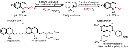 该研究工作首次选用简单已得的喹啉盐衍生物为研究对象,在前期过渡金属催化芳基硼酸不对称转化的研究工作基础(Chem. Commun. 2013, 49, 3360-3362;Chem. Commun. 2011, 47, 12813-12815)上,创新地发展了基于过渡金属铑催化喹啉盐衍生物的不对称去芳香化加成反应。以芳基硼酸为亲核试剂时,在手性铑催化剂存在下,实现了喹啉盐衍生物的不对称1,2-芳基化加成,获得2-芳基取代的二氢喹啉化合物(其光学纯度课高达99%);以烯基硼酸为亲核试剂时,在手性铑催化剂存在下,进一步实现了喹啉盐衍生物的不对称1,2-烯基化加成,获得2-烯基取代的二氢喹啉化合物(其光学纯度课高达96%)。所发展的不对称催化策略具有喹啉盐衍生物便宜易得;高立体选择性,所获得的二氢喹啉化合物具有很高的光学纯度;二氢喹啉化合物中的碳碳双键非常容易进一步官能化,从而获得期望的目标分子等优点。研究者基于这些优点,进一步发展了该合成策略的应用。其中,以N-甲基喹啉碘化盐为原料,通过2步反应可分别实现天然产物(-)-angustureine和(+)-cuspareine的全合成,也可通过2步反应实现药物活性分子关键中间体的合成,该药物活性分子是一种选择性雌激素受体调节剂(SERM)和一个潜在的MCF-7细胞增殖抑制剂(IC50 68 nm)。显然,该工作为合成天然生物活性四氢喹啉衍生物提供了一种高效、简洁的合成策略。
