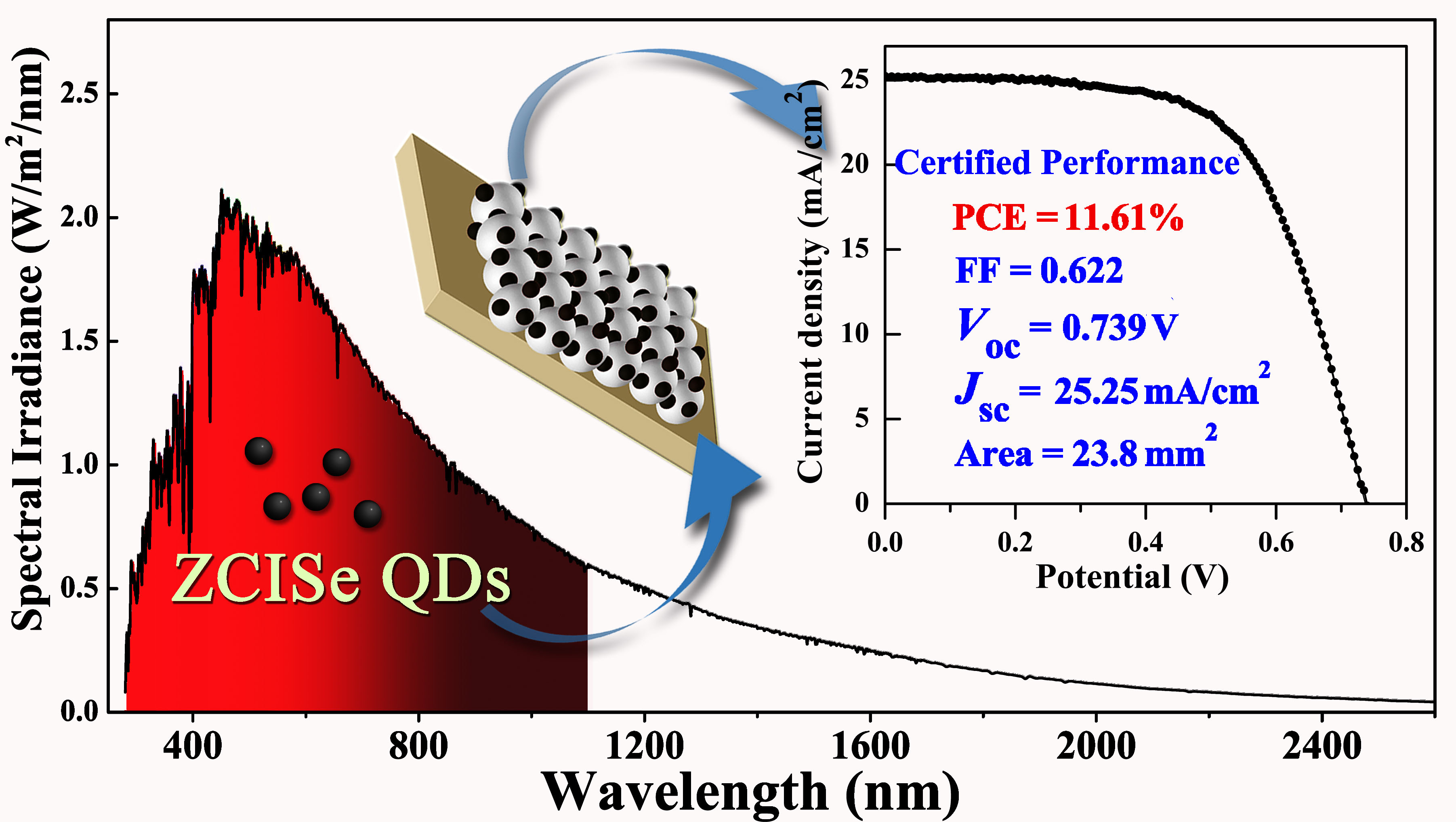 QDSC是用半导体量子点作为光捕获材料的敏化太阳电池。由于量子点优异的光电性能及敏化构型对材料纯度的低依赖性,QDSC具有 “高效率、低成本”潜质,因而引起了广泛的关注。虽然近年来QDSC的效率取得了令人鼓舞的进展(从2012的5%提高至数月前的9.0%),但10%转换效率这一太阳电池商业应用的门槛对QDSC来说仍是可望不可及。另一方面目前大部分高效率QDSC均是基于含高毒性铅、镉元素的量子点,这无疑将影响其日后商业应用。基于“绿色”材料理念,该课题组设计合成出具有如下优异光电性能的不含高毒性重金属的Zn-Cu-In-Se (ZCISe)合金量子点光捕获材料:1) ~ 4 nm的小粒径使得量子点在TiO2介孔膜电极高效、快捷沉积;2) 展宽至近红外波长的吸光范围;3)合金结构保证了高效的光生电子注入及有效地抑制了光阳极/电解质界面电荷复合。受益于上述优异的光电性能,组装出的Zn-Cu-In-Se QDSC取得了11.61%的认证效率。这一结果为所有类型量子点太阳电池(包括敏化构型及异质结构型)的最高效率,同时也将QDSC光伏性能第一次提升到了与同类型染料敏化太阳电池相同水平。