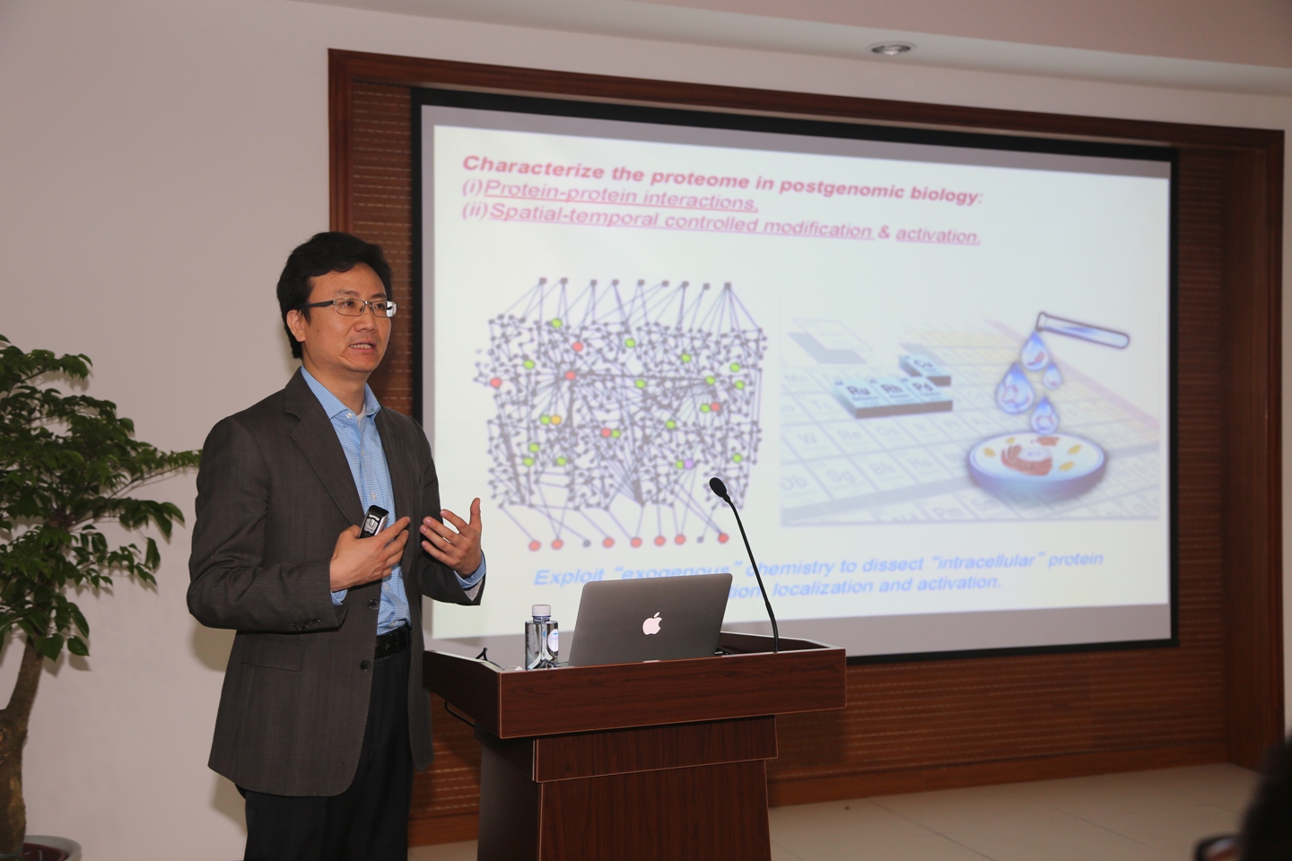 陈鹏教授报告中指出:活细胞内的化学工具能够实现对蛋白质的原位研究,具有极大的优势。其课题组以面向活细胞水平的蛋白质化学修饰与调控为主线,发展了一系列新颖的活细胞化学工具和探针,实现了活体环境的光交联、偶联标记、化学脱笼等一系列新型蛋白质化学反应。利用该“活体工具箱”,他们在捕捉和研究蛋白-蛋白相互作用,蛋白质特异标记与信号转导通路激活等方面开展了深入的研究,尤其是揭示了宿主-致病菌相互作用的分子机制,开辟了利用化学生物学技术研究蛋白质结构与功能的新策略。