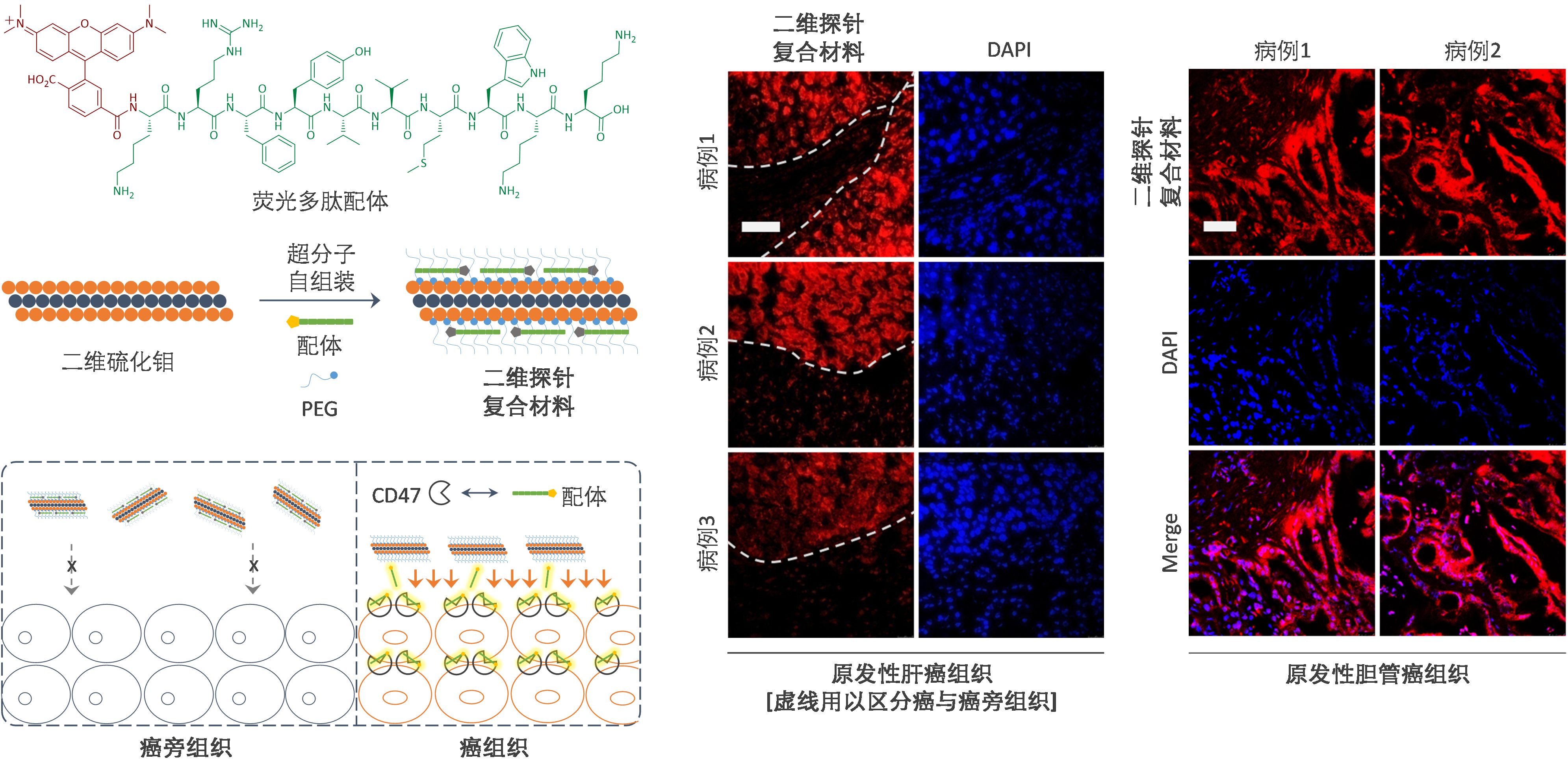 目前临床对于肝癌,尤其是胆管癌的诊断缺乏高灵敏度与特异性的肿瘤标志物,使得肝胆肿瘤的早期发现与治疗成为医学难题。CD47是一类广泛存在于人细胞膜表面的糖蛋白,并被证明在多种癌细胞表面过度表达,然而由于缺乏有效的蛋白检测工具,CD47在肝癌与胆管癌中的蛋白表达水平鲜见文献报道。基于这一关键医学问题,我院研究人员与第二军医大学东方肝胆外科医院相关研究团队合作,通过简易的超分子组装策略,构建了一种荧光多肽配体与二维硫化钼复合的探针材料,并应用这一探针复合材料的荧光“关开”性质揭示了CD47在肝癌和胆管癌细胞中过度表达。更为重要的是,研究团队还应用此类二维探针材料实现了对确诊为原发性肝癌与胆管癌的临床组织标记,并通过荧光有效区分了癌与癌旁组织(上图)。本研究为恶性肿瘤标志物的高效探测提供了新的分子探针工具,还为肝胆肿瘤揭示了一种潜在的肿瘤标志物。