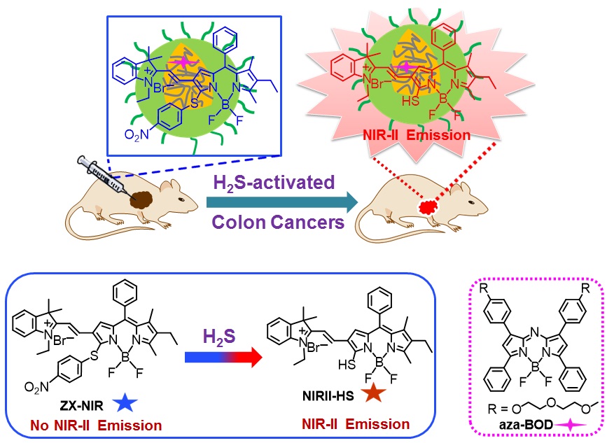近年来,荧光成像技术广泛地应用于生物医学研究领域。但发光在可见区/近红外一区的传统荧光探针通常面临(1)差的生物组织穿透力和(2)在深层次生物组织内低的分辨率等急需的问题。相比可见光和近红外一区发光,近红外二区发光具有组织穿透能力深并且深层次生物组织内高的分辨率等特点。基于上述问题,研究人员创新的设计合成了一个智能型纳米荧光探针,包含一个硫化氢可激活型近红外二区荧光染料和一个“always-on”型近红外一区染料。利用该探针,成功证实了可激活型探针相比“always-on”探针具有特异性和靶向性等特点;近红外二区荧光相比一区荧光具有深层次生物组织内高的分辨率等优越性。该探针是第一例报道的可激活型近红外二区硫化氢纳米荧光探针,实现了活体中HCT116结肠肿瘤与肝癌肿瘤的检测与区分。