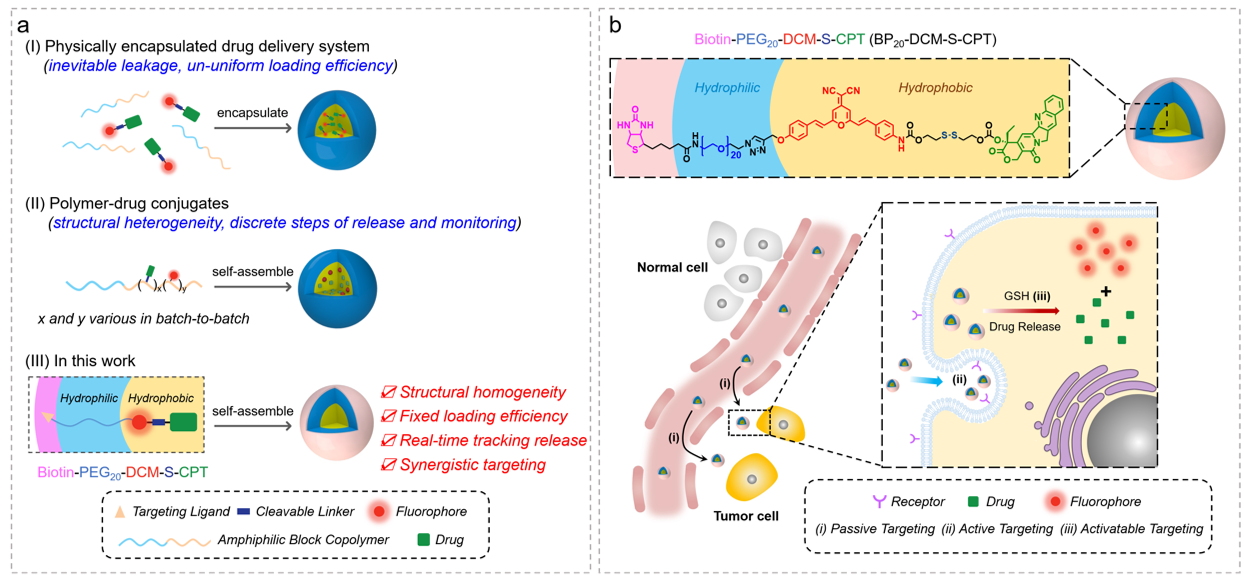 实时监测药物的传递和可控释放是实现肿瘤靶向性精准治疗的关键环节之一。目前诊疗一体化纳米前药的策略主要基于物理包裹或化学修饰聚合物、脂质体和无机材料等相结合。然而,这些纳米前药的结构异质性和无法实现活体示踪药物释放严重阻碍了其在临床转化方面的应用。近日,化学学院精细化工研究所郭志前和朱为宏教授课题组报道了一种基于近红外吡喃腈染料构建的单组份自组装纳米前药,该工作提出了单组份自组装纳米荧光前药的设计策略,以避免批次间因结构异质性导致的迥异的生物分布和治疗效果,同时实现前药在体内释药行为的实时跟踪。
