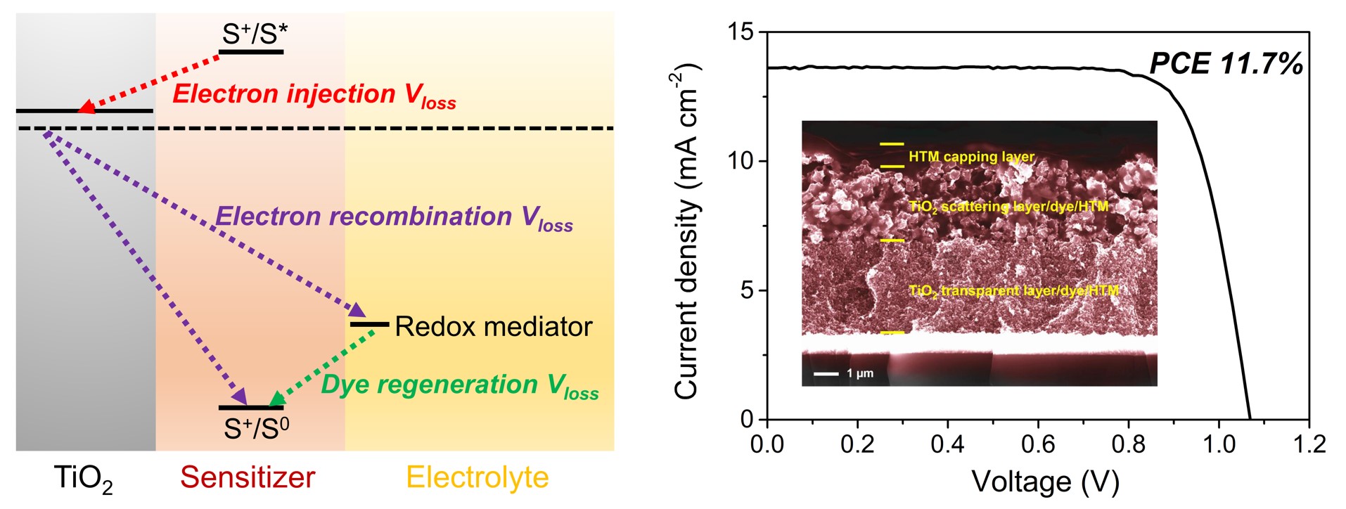 激子型太阳能电池中较大的电压损失严重制约了其能量转换效率(Power conversion efficiency, PCE)。研究人员通过染料敏化剂和电解质的有效分子工程,对DSSCs中的电子注入、染料再生和电子复合过程中的电压损失进行全面地定向调控,显著减小了染料能带隙(Energy gap)与开路电压(VOC)之间的“Trade-off”效应。经过合理优化,代号为WS-72的新结构染料在铜基液态电解质中获得了1.1 VVOC值,该光电压表现与高效率的钙钛矿太阳能电池相当。进一步对电池器件中电解质进行固化处理得到的全固态DSSCs取得了11.7%的能量转换效率(短路电流为13.8 mA cm-2、开路电压为1.07 V、填充因子为 0.79),这也是目前全固态染料敏化太阳电池的最高能量转换效率。该工作为从电池工作原理根本上减小激子型太阳能电池中的电压损失以提高其能量转换效率提供了新的思路。