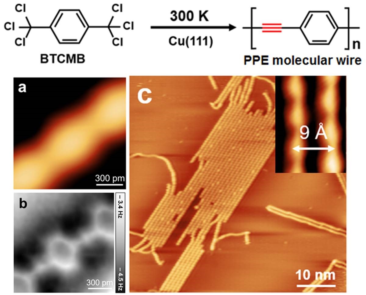 该课题组成功发展出通过三氯甲基偶联原位构建C≡C键的反应,在室温下即可在洁净的Cu(111)表面原位生成通过一般的表面反应难以获得的poly(p-phenylene ethynylene)分子线(图一)。另外,通过与裘晓辉课题组合作,使用非接触原子力显微镜(nc-AFM)和DFT计算模拟对三氯甲基偶联反应的机理进行研究发现:在逐渐升高温度时(5-70 K),三氯甲基会逐个脱掉氯原子,依次生成被Cu基底稳定的苄基自由基中间体、卡宾中间体和卡拜中间体。之后,卡拜中间体发生偶联反应生成C≡C键。在反应过程中,Cu(111)基底对反应起到了至关重要的活化作用,大大降低了反应的活化能,并且非常有效地稳定了自由基中间体。