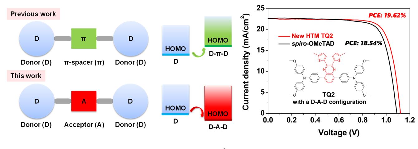 钙钛矿太阳能电池的空穴传输层能够促进光生电荷的提取和收集,并保护吸光层。目前,钙钛矿太阳能电池器件中常用的HTM是2,2',7,7'-四[N,N-二(4-甲氧基苯基)氨基]-9,9'-螺二芴(spiro-OMeTAD),其昂贵的成本是制约钙钛矿太阳能电池实际应用的瓶颈之一。部分研究工作表明,将复杂的螺芴核替换成简单的π桥连,构建给体-π桥连-给体(D-π-D)型HTM,可以简化合成路线,降低成本。然而,π桥连的富电子性会抬高分子HOMO能级,降低其本征稳定性。研究人员通过引入弱吸电子的喹喔啉单元,构建给体-受体-给体(D-A-D)型HTM,合理调控HTM的HOMO能级,优化钙钛矿太阳能电池器件界面能带排布。与spiro-OMeTAD相比,这种D-A-D型的HTM分子具有更好的光稳定性,热分解温度提升了30 oC,合成成本降低了30倍。以噻吩取代的HTM分子TQ2制备的钙钛矿太阳能电池器件取得了19.62%的光电转换效率,优于参比化合物spiro-OMeTAD(18.54%)以及苯环取代的HTM分子TQ1(14.27%)。荧光寿命表征以及导电率测试表明噻吩取代的HTM分子有更好的空穴提取和传输能力。进一步通过单晶分析发现TQ2分子间存在S---S以及S---π相互作用,缩短了分子间三苯胺单元的距离,增加了空穴传输通道。该工作为设计低成本、高性能的钙钛矿太阳能电池空穴传输层提供了新思路。