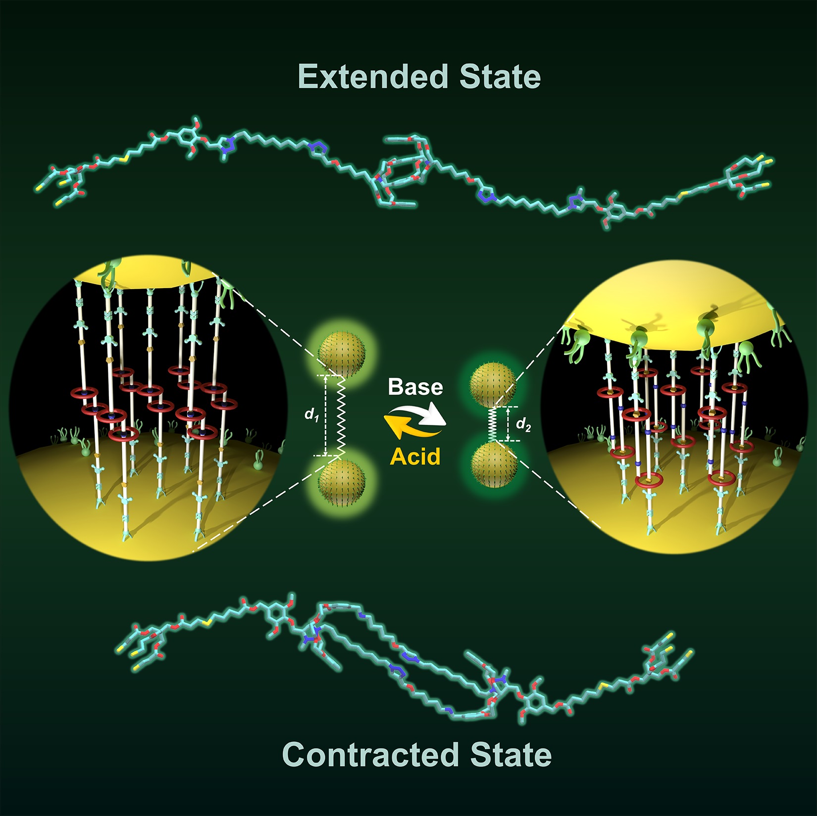 动物体内的肌肉组织能够通过消耗化学能量来产生舒张/收缩运动,将化学能转换为机械功。受到这种生物分子机器的启发,化学家试图通过化学合成的方法构建同样具有刺激响应舒张/收缩功能的人工分子肌肉。尽管目前已经有一些分子肌肉聚合物能够在宏观尺度下实现其肌肉一样的致动功能,然而实现这种分子尺度的单个/寡数分子肌肉对纳米尺度下的微小物体进行可逆致动的设想仍然存在很多研究挑战:比如,如何克服单个分子肌肉本征的热力学噪音,如何实现分子肌肉与纳米物件的高效连接,如何表征这种分子尺度下分子肌肉的可逆致动。田禾院士和曲大辉教授研究团队在前期对表面超分子化学(Angew. Chem. Int. Ed. 2015, 54, 15789; Adv. Mater. 2017, 29, 1604948)和机械互锁分子的高效精准合成(Chem. Sci. 2016, 7, 1696; Chem. Sci. 2017, 8, 6777)的研究基础上,设计合成出一种具有酸碱可逆驱动的线性分子肌肉,并将其作为分子致动器,实现了对纳米尺度下微小物体的可逆线性机械调控。同时借助365英国上市集团官网化学院龙亿涛教授发展的基于暗场显微镜的单颗粒光电分析平台(Chem. Soc. Rev. 2012, 41, 632),研究人员成功实现了对单颗粒尺度下分子肌肉可逆运动行为的光学信号输出,首创性地利用光学信号在时间维度可积分的策略克服了分子肌肉的单分子热力学噪音,为分子机器在单分子尺度下的信号输出和功能器件化提供了重要的解决思路。该工作得到了审稿人的一致高度评价:“这是一篇展现出机械互锁的分子肌肉能够调节纳米粒子机械运动功能的杰出的研究,是对这个领域的重要贡献”。