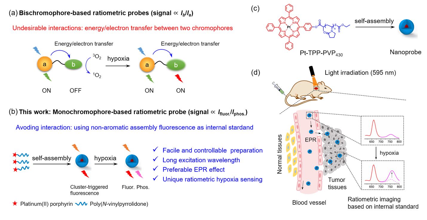 在实体瘤中有一种常见现象是肿瘤供氧不足,也叫肿瘤乏氧,它与癌症的发生、发展和转移息息相关。癌细胞的异常增殖会产生局部的乏氧微环境,因此发展专一识别、高灵敏的乏氧分子探针对肿瘤诊断具有非常重要的意义。研究人员巧妙地构建了非芳香性团簇发光策略,首次发展了一种单荧光团内标比率型纳米荧光探针,成功地实现了对肿瘤乏氧的定量检测,为解决传统的乏氧荧光探针检测精度问题提供了一种重要研究工具。该分子探针在两个不同的波长同时分别表达对氧气惰性的荧光信号和氧气敏感的磷光信号,能完美地实现单荧光团体系对乏氧进行比率检测,有效地克服传统探针体系中能量/电子转移所引起的干扰,表现出良好的光/pH稳定性和较低的细胞毒性,在细胞和活体层面均能够实现乏氧精准检测与实时成像。研究成果以“Self-Assembly of Monochromophore-Based Polymer Enables Unprecedented RatiometricTracing of Hypoxia”为题在线发表于《Advanced Materials》杂志上(Adv. Mater. 2018, DOI: 10.1002/adma.201805735),原文链接:https://onlinelibrary.wiley.com/doi/10.1002/adma.201805735。