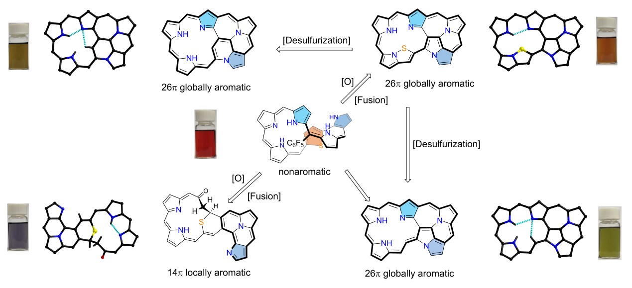 卟啉广泛存在于叶绿素和血红素等自然界功能体系,具有重要生理活性和突出光电性能。通过改变卟啉四吡咯大环框架而发展起来的异卟啉,在离子识别、超分子组装、荧光探针、多金属配位、近红外功能染料等领域具有独特的优势和良好的应用前景。其中,关于异卟啉大环之间转化反应的研究有助于发展新型异卟啉骨架,从而进一步拓展结构与性能,具有重要价值。解永树教授课题组在该领域前期系列研究基础上,发展了一种调控异卟啉大环结构与芳香性的新策略:将噻吩单元引入卟啉体系,创造性地利用错位吡咯单元活化噻吩的开环与脱硫反应,实现有趣的大环重排反应和独特的骈连结构,成功合成具有特殊整体芳香性与局部芳香性的新型异卟啉。基于该方法,可进一步设计、合成具有独特结构与性能的新型异卟啉,拓展结构与功能,应用于新型有机光电功能材料等领域。