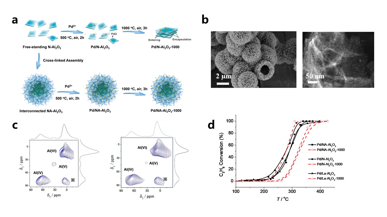 1a)纳米片和空心球等两种结构的Al2O3载体影响Pd活性位热稳定性的示意图;(bPd/NA-Al2O3催化剂的SEMTEM图;(c)空心球结构Al2O3载体负载Pd前后的二维27Al MQ MAS NMR;(dPd/NA-Al2O3催化剂的丙烷催化燃烧活性(原料气组成:0.2 vol%C3H8+2 vol%O2/Ar,空速30 000 mL·h1·gcat1