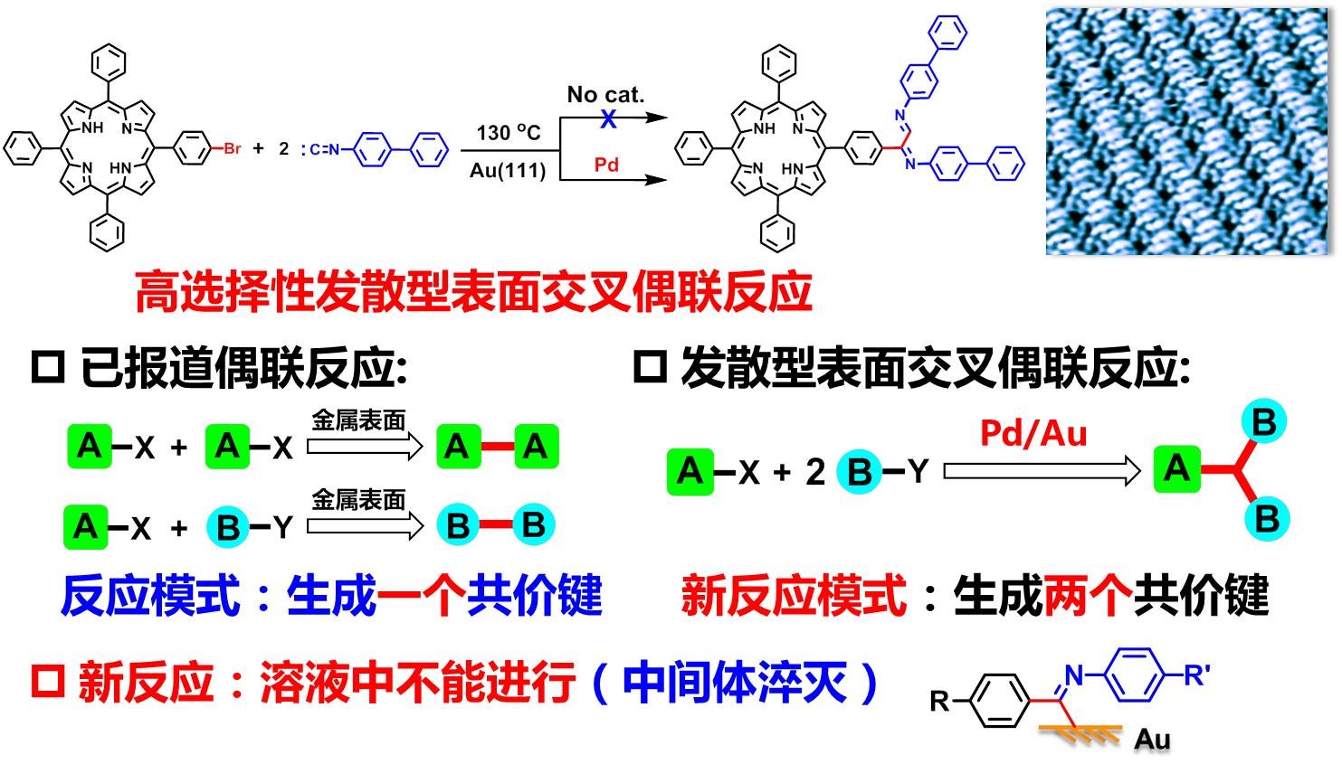 在本研究工作中,利用该课题组所发展的“外源性催化剂策略”,使用钯原子为催化剂,在Au(111)表面上实现了一分子芳基溴化物与两分子异氰的新型发散型交叉偶联反应(A+2BA-2B型新反应模式,一步生成两个共价键),并具有很高的反应活性和选择性。需要强调的是,在溶液中,这芳基对一分子异腈加成所得的自由基中间体由于缺乏基底表面的吸附保护,容易与环境分子反应而淬灭。所以,这一反应在溶液中不能进行。