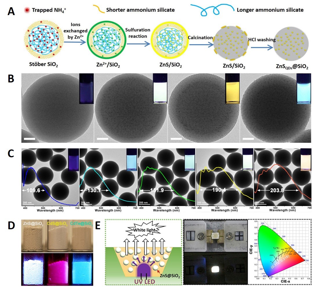 该研究团队开发了一种直接在SiO2小球体相内生长量子点的液相合成新方法——“trapped NH4+”离子交换法(图A)。他们利用“trapped NH4+”易与Zn2+、Cd2+等金属阳离子发生离子交换反应的特性,成功将金属阳离子引入SiO2小球体相(图A,B)。再通过室温硫化直接生成金属硫化合物。最后通过巧妙的酸洗与醇洗过程(酸的浓度需要调控),可选择性地将SiO2小球表面覆盖的“bulk”硫化物洗掉,再通过高温煅烧实现SiO2小球体相量子点的晶化。在煅烧过程中,利用SiO2小球体相孔道的“限域效应”,有效抑制了量子点晶化过程中团聚现象的发生。与此同时,不同尺寸孔道的“限域效应”可以很好地控制量子点的尺寸分布,使制得的量子点在紫外光照射下直接发射白光。传统通过三原色量子点的组合构筑白光LEDs的方法重现性较差,且量子点发射波长的半峰宽难以控制。而“trapped NH4+”离子交换法合成量子点的策略,可通过调节煅烧温度,控制SiO2小球的孔道尺寸分布,从而实现对ZnS@SiO2等量子点荧光发射光谱半峰宽的调控(半峰宽可从109.6调节到203.8 nm,图C)。值得注意地是,整个量子点的合成过程是在纯水体系中完成,不需要任何油相试剂,也不需要加入任何有机“capping-agent”。