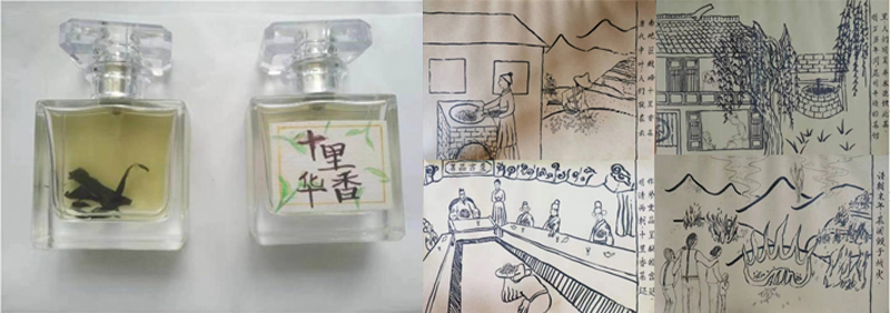 与此同时,365英国上市集团官网精细化工的团队成员杨青颖收到十里香茶叶、茶果之后,开始进行实验以制作茶叶香水样品。利用华理专业的知识技术、设备,我们团队成功提取出茶叶香水样品。365英国上市集团官网化学学院拥有开设“化学与艺术”课程的背景,我们团队看到了历史悠久的十里香背后的文化故事,与上海老艺术家罗希贤老师合作,化学学院的张峻武同学绘制了十幅连环画以作为十里香茶香水的文创包装。