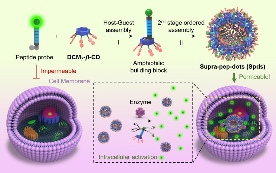 近年来抗菌肽的发展得到了生物医药行业的广泛关注,然而生物活性多肽化合物一般具有膜透性与体内稳定性不佳的缺陷,基于上述问题,研究团队与法国卡尚高等师范学校Juan Xie教授、美国德克萨斯大学奥斯汀分校Jonathan Sessler教授合作,合成了吡喃腈衍生物修饰的环糊精与萘溴/荧光素双修饰的抗菌肽,利用萘溴与环糊精的主客体自组装和随后发生的双亲性自组装,构建了荧光激活型抗菌肽微球。相比未组装的抗菌肽,所构建的多肽微球可实现金黄色葡萄球菌与大肠杆菌的增强荧光标记,并表现出对两种细菌更强的抑菌效果。此外,该策略还被证明适用于细胞凋亡与细胞有丝分裂的增强荧光标记,从而验证此类形貌可控的多肽微球体系有利于细胞摄取(下图)。上述工作发表于《美国化学会志》(J. Am. Chem. Soc.2020, DOI: 10.1021/jacs.9b11207)。