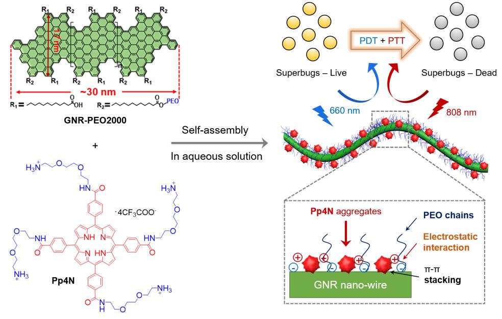 基于前期糖基二维自组装材料构建及其光动力学与光热双模式抗绿脓杆菌的工作基础(Adv. Funct. Mater.2019, 29, 1806986),研究团队与上海交通大学麦亦勇教授合作,合成了结构可控的石墨烯纳米带材料,验证了其优异的光热性能(Angew. Chem. Int. Ed.2018, 57, 3366),并进一步与韩国梨花女子大学Juyoung Yoon教授合作,合成了阳离子型卟啉衍生物,通过静电、-堆叠等非共价相互作用,构建了石墨烯纳米带/卟啉复合材料,通过一系列体外与在体实验证明,该材料可经由电荷吸引结合到细菌表面,进而通过光诱导纳米带的光热性能与卟啉光动力学性能,协同抑制一系列革兰氏阳性与革兰氏阴耐药菌的生长,并进一步实现了小鼠表皮感染超级细菌的高效清除,其性能优于临床常规抗生素药物(下图)。上述工作为临床超级细菌感染提供了一类非抗生素型抗菌材料,相关成果发表于《德国应用化学》(Angew. Chem. Int. Ed.2020, DOI: 10.1002/anie.201913506)。
