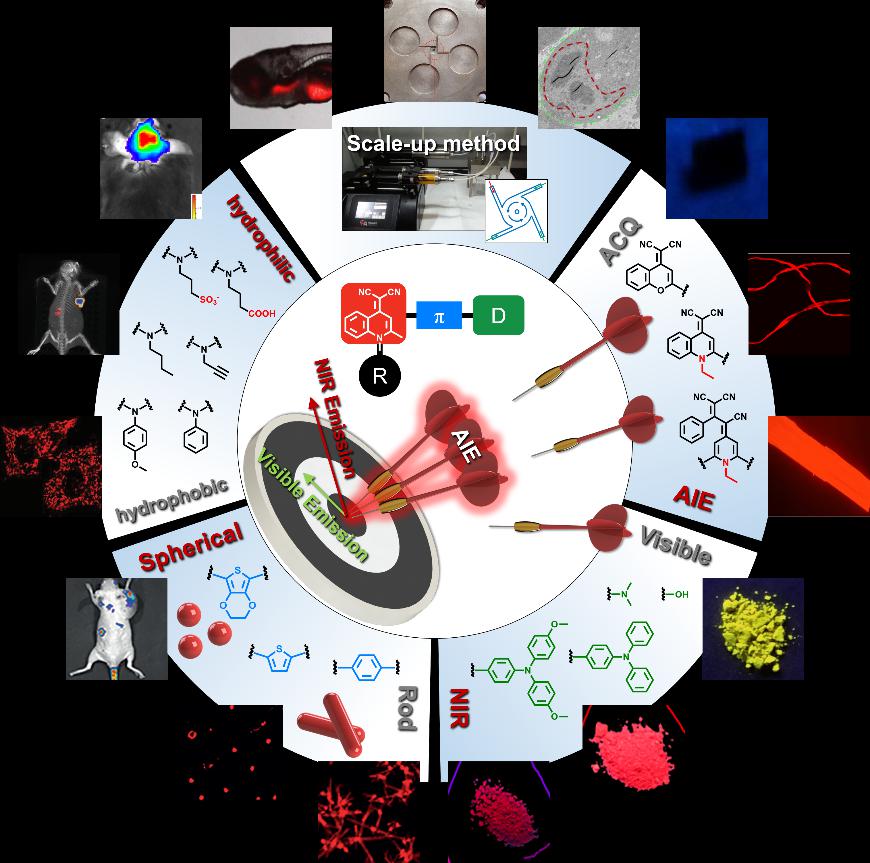 高性能近红外染料已经被广泛用于生物传感、医学成像、非线性光学和太阳能电池等诸多新型领域。该课题组一直致力于突破染料革新应用中的关键技术,开展高性能、高附加值的荧光染料创制和应用基础研究,已在发展高性能近红外荧光染料方面取得阶段性的成果。基于分子结构设计源头创新,构建了具有自主知识产权的高稳定性、长波长染料新母体―喹啉腈单元体系,有效提升量子效率等应用性能,解决了染料波长拓展与效率提升难以兼顾的困境,显著提升其应用拓展性能。最近,课题组受邀在《德国应用化学》上发表“High-Performance Quinoline-Malononitrile Core as Diversity-Orientated AIEgens”的综述,围绕课题组所发展的喹啉腈染料新母体,系统介绍了其聚集发光响应机制、波长和形貌调控、纳米化宏量制备以及在生物成像方面构建可激活型荧光探针等,Angew. Chem. Int. Ed.2020, DOI: 10.1002/anie.201913249; https://onlinelibrary.wiley.com/doi/abs/10.1002/anie.201913249.
