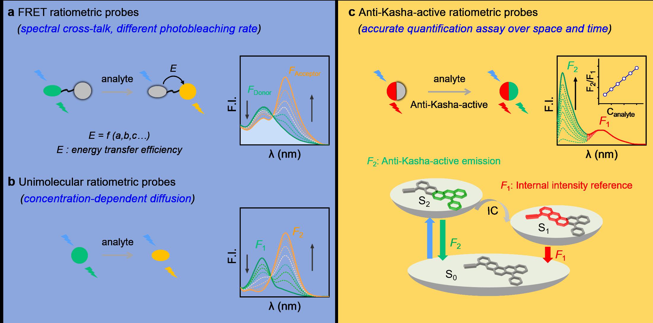 近红外荧光染料在生物医学领域具有非常广阔的应用前景,特别是随着荧光成像技术的快速发展,利用荧光探针对生物分子定量检测已经成为研究热点和焦点。基于荧光团共振能量转移(FRET)构建比率型探针提高检测精准度是通常采用的策略,但在动态细胞环境中不同荧光团的光漂白速率差异和浓差扩散效应难以避免。迄今为止,在高度异质和动态的生物活体环境中,如何消除荧光探针信号易受到目标分子和其他因素(如探针浓度、激发光功率和细胞环境)的影响,精准获取生物分子的定量信息一直面临着重大挑战。