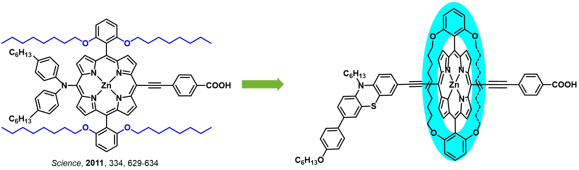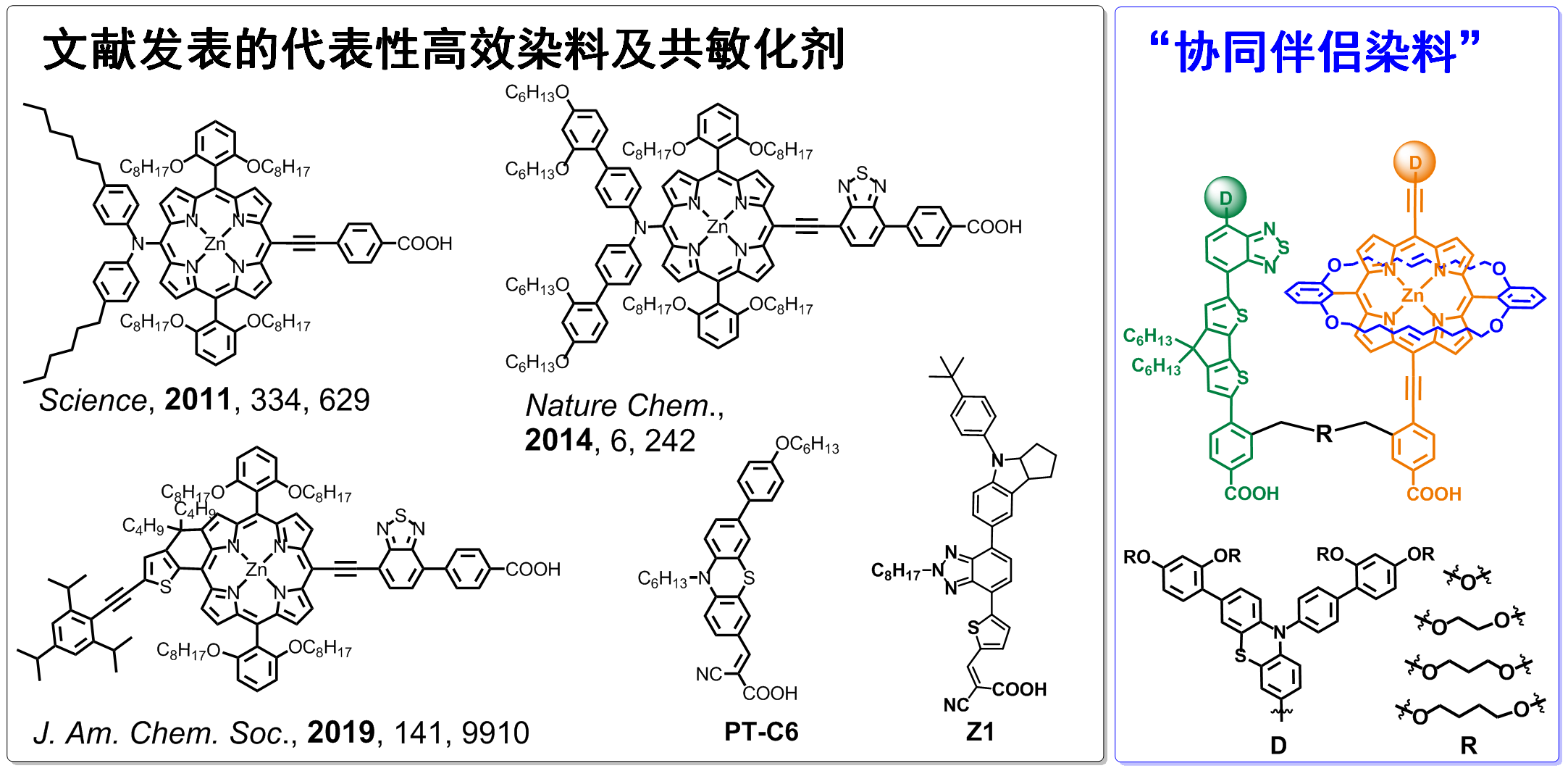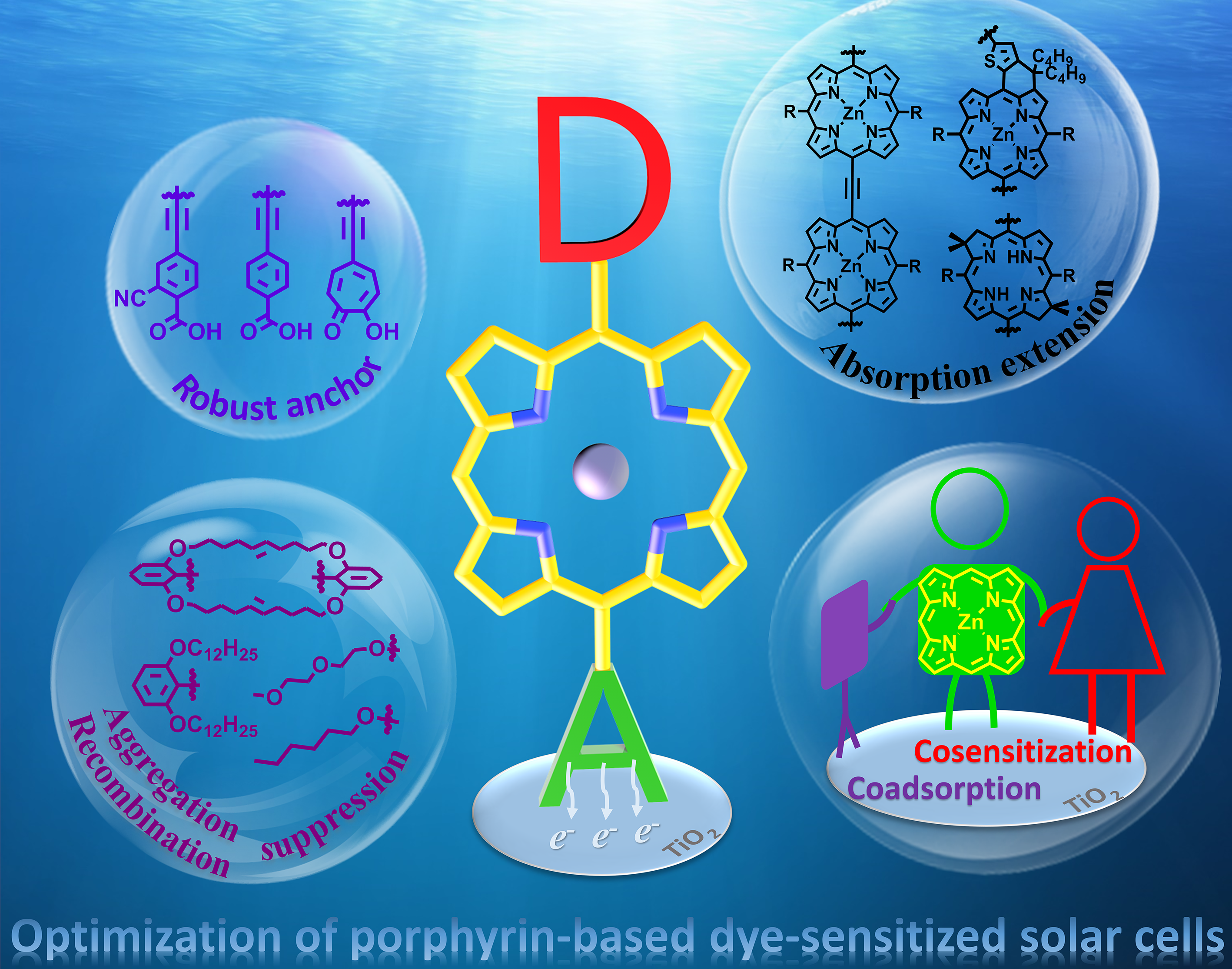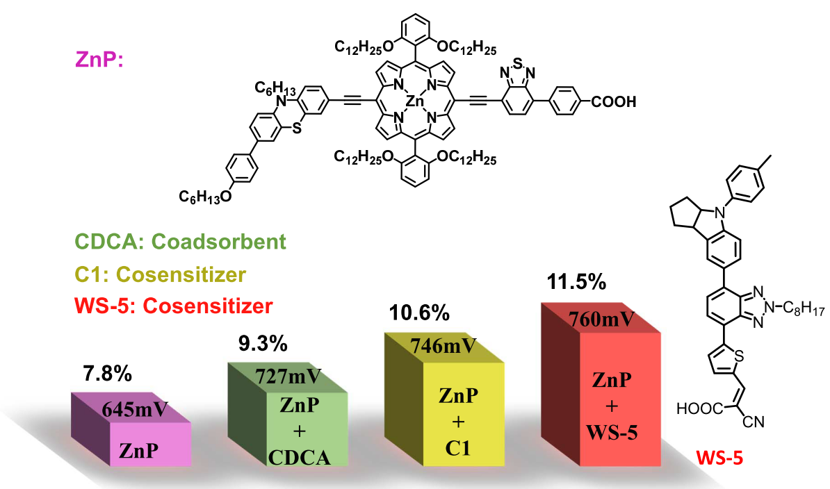 为了提升光捕获能力,并促进光生电子的转移,通常将卟啉染料设计成DπA 型 (电子给体π 桥电子受体) 推拉电子结构,吸附于二氧化钛薄膜,构筑 DSSCs。前期研究中,解永树教授研究团队通过系统优化电子给体及额外电子受体单元,从拓展  共轭结构和增强分子内电荷转移 (ICT) 效应两方面着手,拓展吸收光谱。在此基础上,进一步运用小分子共敏化剂弥补卟啉染料吸收缺陷,显著提升电流。同时,引入多条烷基链,抑制染料聚集和电荷复合,有效提升电压。通过这些策略的综合运用,实现电池短路电流和开路电压的协同提升,实现了当时非钌染料碘电解质电池的最高光电转换效率 11.5% (Angew. Chem. Int. Ed., 2014, 53, 10779; J. Am. Chem. Soc., 2015, 137, 14055)。
