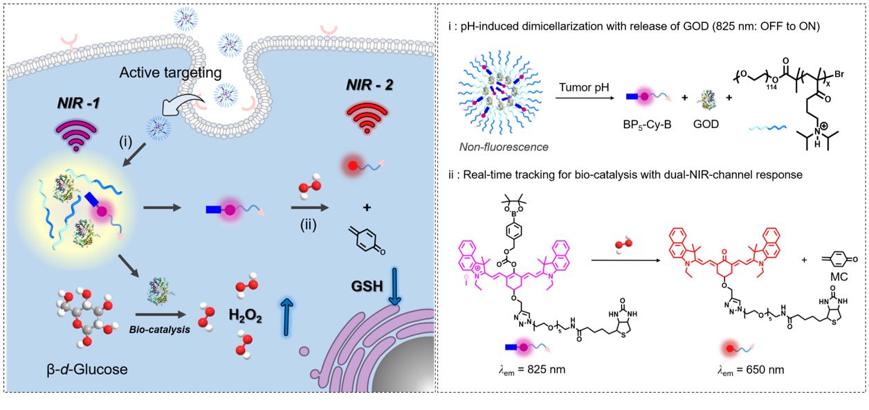 基于双通道近红外染料分子设计平台,创新构建靶向癌细胞的荧光探针监测葡萄糖氧化酶(GOD)触发的细胞内氧化应激水平变化,构建了可视化的肿瘤特异性级联纳米治疗体系。利用近红外双通道荧光实时监测生物分布和在时空模式下激活的过程,实现了体内实时跟踪肿瘤特异性的诊疗,相关研究成果发表在《化学科学》(Chem. Sci., 2020, 11, 3371-3377)。