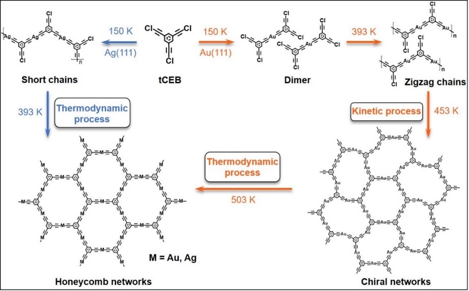 在超高真空条件下,利用扫描隧道显微镜(STM)作为表征手段,他们发现随着退火温度从150 K到503 K的不断升高,三个炔-氯键在金衬底的促进下可以可控地逐个发生活化,分别生成金属有机单体,二聚体、锯齿状链、手性网格等中间体,最后手性网格发生解聚和重组形成热力学稳定的蜂窝状炔-金属二维MOFs(图二)。结合STM实验观测和密度泛函理论(DFT)计算,他们对非常罕见的手性网格的形成机制以及其向蜂窝状结构转化的内在驱动力进行了探究。
