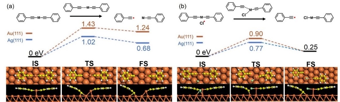 此外,炔-金属键的断裂/形成反应的可逆性对形成热力学稳定的炔-金属二维MOFs至关重要。基于STM观测和DFT计算的结果,他们发现炔-金属键的断裂反应能垒在氯原子的协助下大幅降低,进而揭示了氯原子在炔-金属键断裂过程中的促进作用,阐明了大面积、规则的炔-金属有机网格结构形成的内在机制(图三)。