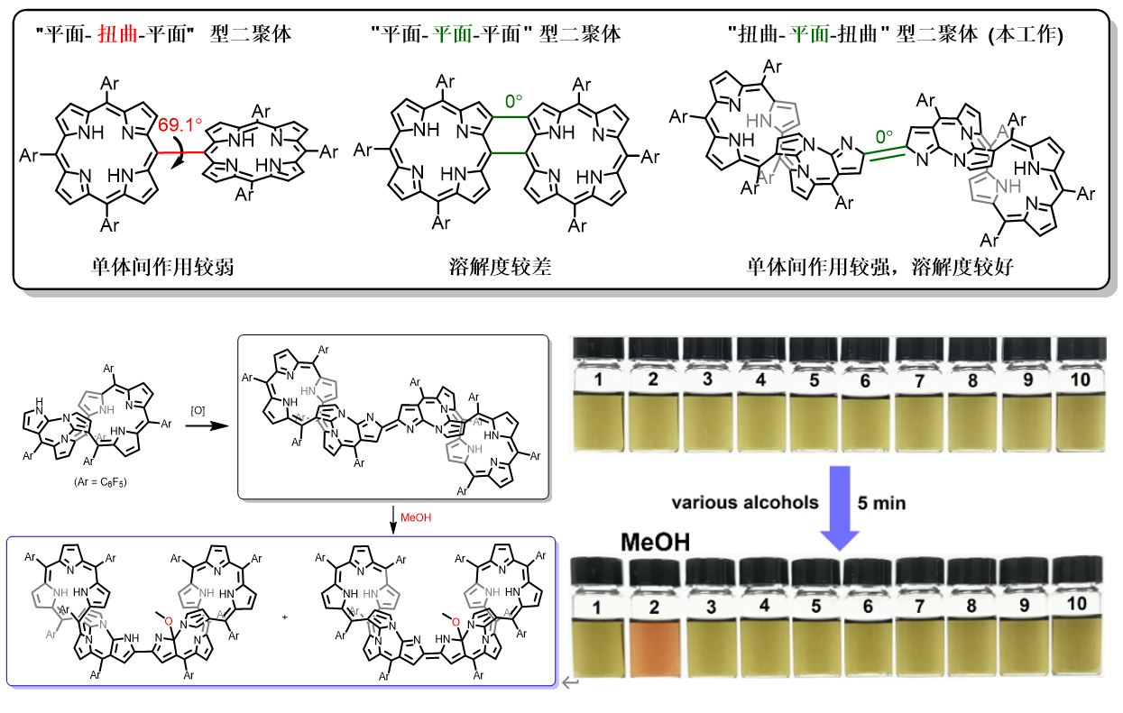 卟啉具有稳定的四吡咯共轭大环结构,可应用于发光材料、太阳能电池、肿瘤光动力学治疗及催化等领域。与单个卟啉相比,将两个卟啉连接形成的二元卟啉化合物则具有更为独特的性质,如分子内能量/电子转移、双光子吸收、非线性光学等性能,可应用于诸多领域。但目前仍缺乏构建二聚卟啉,尤其是异卟啉-异卟啉二聚体的有效策略。传统的卟啉二聚体主要基于卟啉大环平面结构,形成“平面-扭曲-平面”或“平面-平面-平面”型的分子框架。然而,这两类分子骨架具有其内在的局限性。前者的两个卟啉单体间相互作用较弱,不利于拓展相关性能与应用;而后者整个分子容易聚集,溶解性较差,不利于进一步功能化与应用。