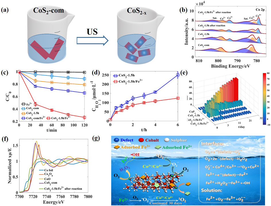 为了克服上述难题,近日,365英国上市集团官网的邢明阳教授团队通过简单超声处理商品化的二硫化钴(CoS2,Alfa Aesar Chemical Co., Ltd.),得到了表面富含缺陷电子的CoS2-x,并构建了CoS2-x/Fe2+体系来持续原位产生H2O2及单线态氧(1O2),实现了对水体中罗丹明B(RhB)、苯酚、磺胺嘧啶等有机污染物的长效降解。超声处理后的CoS2-x表面富含缺陷,缺陷上的电子可活化氧分子生成超氧自由基(•O2-)和H2O2。在CoS2-x表面暴露的Co4+/Co3+的强氧化作用下,•O2-被迅速转化成1O2。相对于羟基自由基(•OH,2.8V,皮秒级),1O2(2.2V,微秒级)虽然氧化能力相对弱一些,但其具有更长的寿命以及更远的迁移距离。牺牲剂实验表明,降解反应中起主要氧化作用的是1O2和•OH。但EPR表征并未得到•OH的信号,这说明1O2对于保持降解体系的长效性发挥重要作用。此外,Fe2+的加入可进一步促进·O2-向1O2的转化,而CoS2-x表面的缺陷电子可实现Fe3+/Fe2+的稳定循环。CoS2-x/Fe2+体系对染料、抗生素以及苯系物均展现了优异的降解效果,在有限时间内可达到100%的降解率。连续降解实验结果显示,CoS2-x/Fe2+体系可实现对RhB(360 mg/L)连续30天的高效降解,而已报道的CuPx体系(•OH为主要ROS)在反应第3天即出现失活。众所周知,基于•OH的传统高级氧化技术(芬顿等)虽然能快速降解污染物,但也会杀死微生物破坏生态系统,因此不适用于治理河流污染。而作者开发的基于1O2的CoS2-x/Fe2+技术,反应温和,过程平稳且持续时间长,有望未来应用于对河流污染的长效治理。