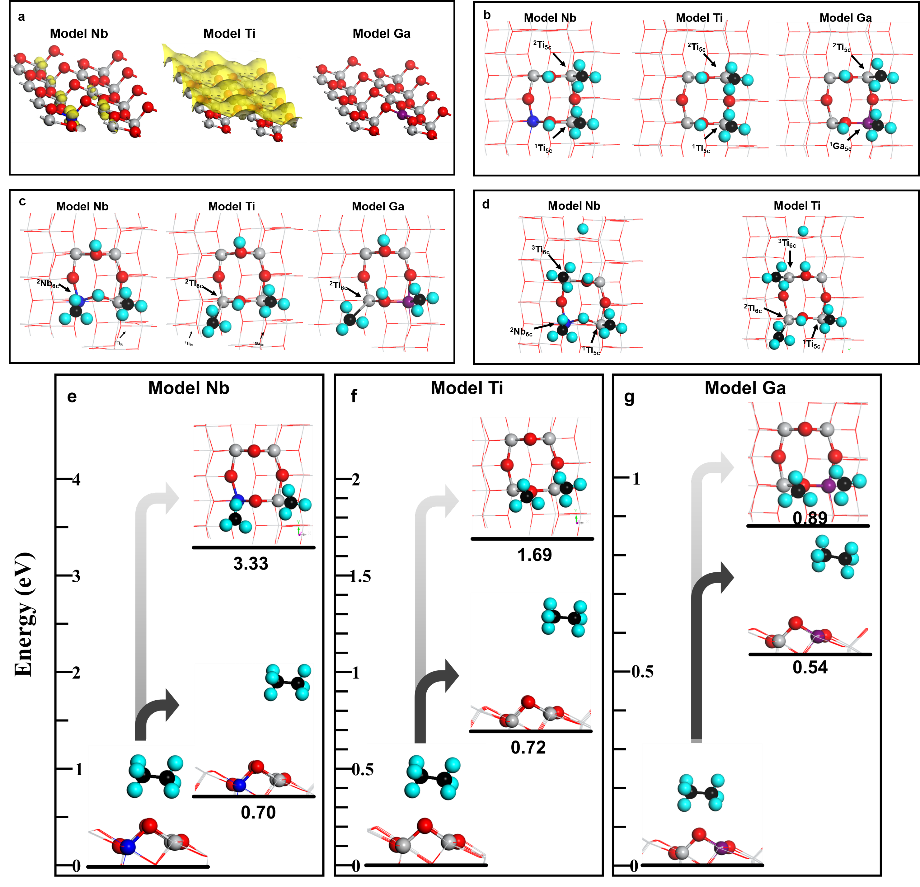 研究表明,钛硅分子筛中掺杂不同类型的过渡金属离子均可促进光生载流子分离,但相比p型掺杂的体系,n型掺杂的催化剂普遍表现出更高的光催化活性,Nb掺杂的催化剂甲烷转化率可达3.57 μmol g-1 h-1,说明甲烷无氧偶联活性不仅仅取决于增强的载流子分离效率。该工作进一步以Nb和Ga作为n型和p型掺杂原子的代表,研究不同类型原子掺杂与甲烷C-H键活化之间的关系。对XAFS光谱进行解析并以DFT所建模型进行拟合, 确认+5价Nb以单原子的形式取代了TiO2 (1 0 1)面六配位Ti原子。相比于未掺杂的TiO2和Ga-TiO2,Nb掺杂可导致Nb原子及沿[0 1 0]方向的六配位Ti原子上形成电子极化子,表明Nb的多余价电子在(1 0 1)面发生离域,并沿[0 1 0]方向局部限域于Nb原子及附近六配位Ti原子。通过DFT计算比较Nb和Ga掺杂模型上的C-H键活化情况,发现Nb及周围Ti原子上的电子极化子与相邻的桥氧联合实现C-H键的极化,虽然六配位处Nb相比五配位处的Ga掺杂位点空间位阻更大,但沿[0 1 0]方向产生的额外的Ti活化位点有利于提高局部甲基自由基的密度,从而促进甲基之间的偶联。更为重要的是,相比Ga掺杂的模型,Nb掺杂增加了产物乙烷C-C键断裂的难度,阻止了逆反应的发生并促进了产物的脱附。最终,更有效地活化-偶联-解吸循环提高了光催化甲烷无氧偶联活性。