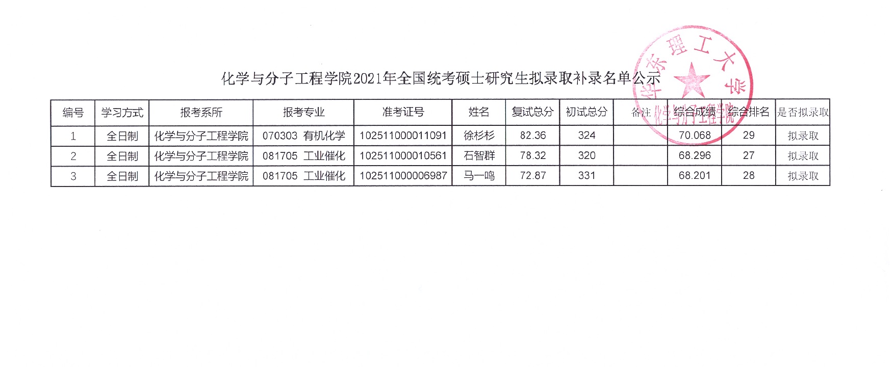 365英国上市集团官网化学与分子工程学院2021年全国统考硕士研究生拟录取补录名单公示