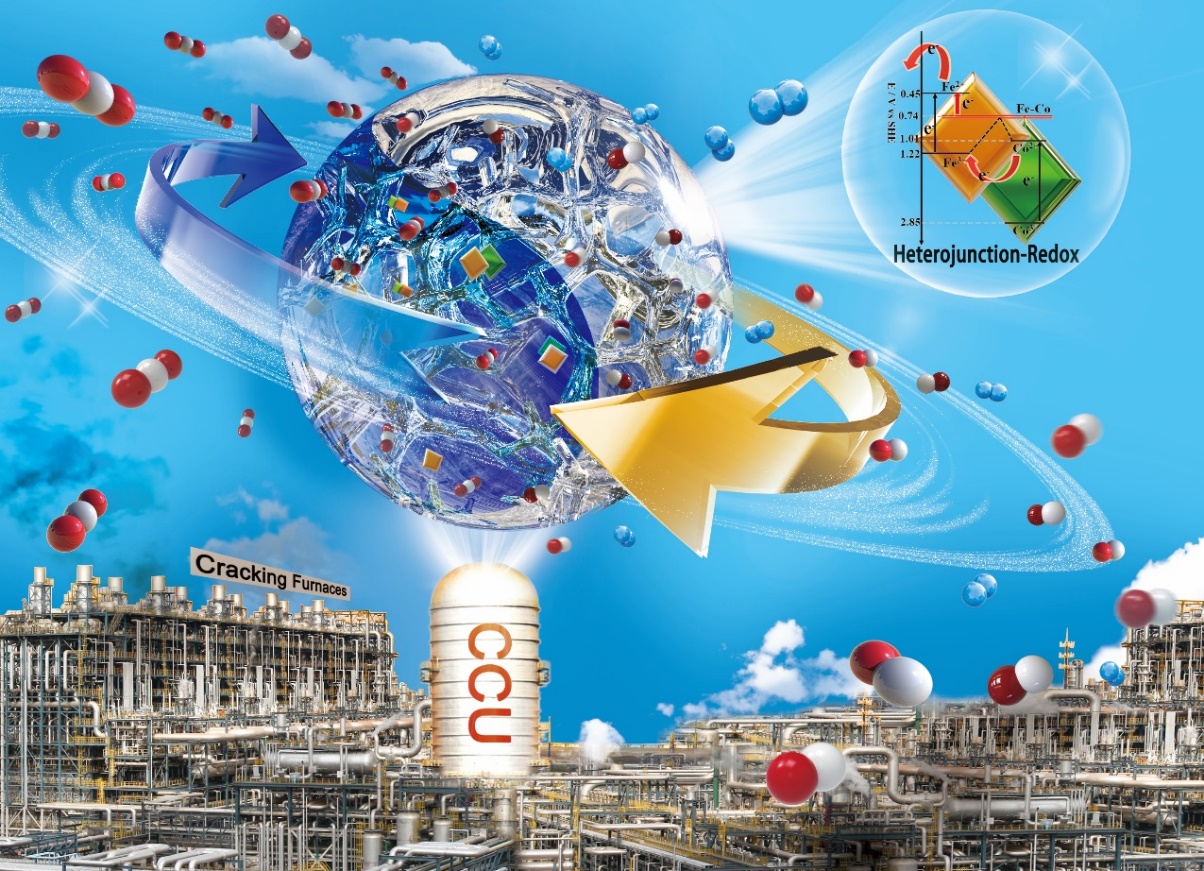 针对上述挑战,化学与分子工程学院胡军教授联合英国谢菲尔德大学王美宏教授在钱锋院士团队和刘洪来教授团队支持下,通过合成具有吸附/催化双功能的复合材料,将钙循环(Calcium-looping,CaL)和逆水煤气变换反应(RWGS)相结合,实现了在同一反应塔相同温度下,对工业裂解烟气进行CO2高温捕集和原位转化。该集成技术具有优异的高温CO2捕集性能,材料的CO2吸附容量高达9.0 mol/kg,成功地解决了CaL过程CaO易烧结的工程瓶颈问题,获得长效循环操作稳定性;首次提出了“氧化还原异质结(Heterojunction-Redox)”的双金属催化策略,使CO2原位转化率接近90%,产品气中CO选择性接近100%,避免了后续分离的工程复杂性。