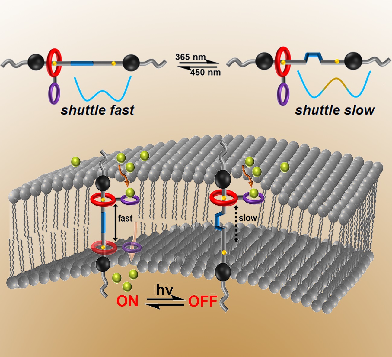 近日,365英国上市集团官网化学与分子工程学院包春燕教授和曲大辉教授合作,在他们利用轮烷分子机器模拟天然转运蛋白的结构和功能,实现高效、阳离子选择性跨膜运输的工作基础上(J. Am. Chem. Soc., 2018, 140, 17992-17998.),进一步引入偶氮苯光致异构基团,通过光调控轮烷梭动实现可逆ON/OFF离子跨膜运输,在具备高效、离子选择性的基础上,进一步实现了门控的离子传输。相关成果以“A Light-Operated Molecular Cable Car for Gated Ion Transport”为题,发表在《Angewandte Chemie International Edition》(DOI:10.1002/anie.202102838)上。