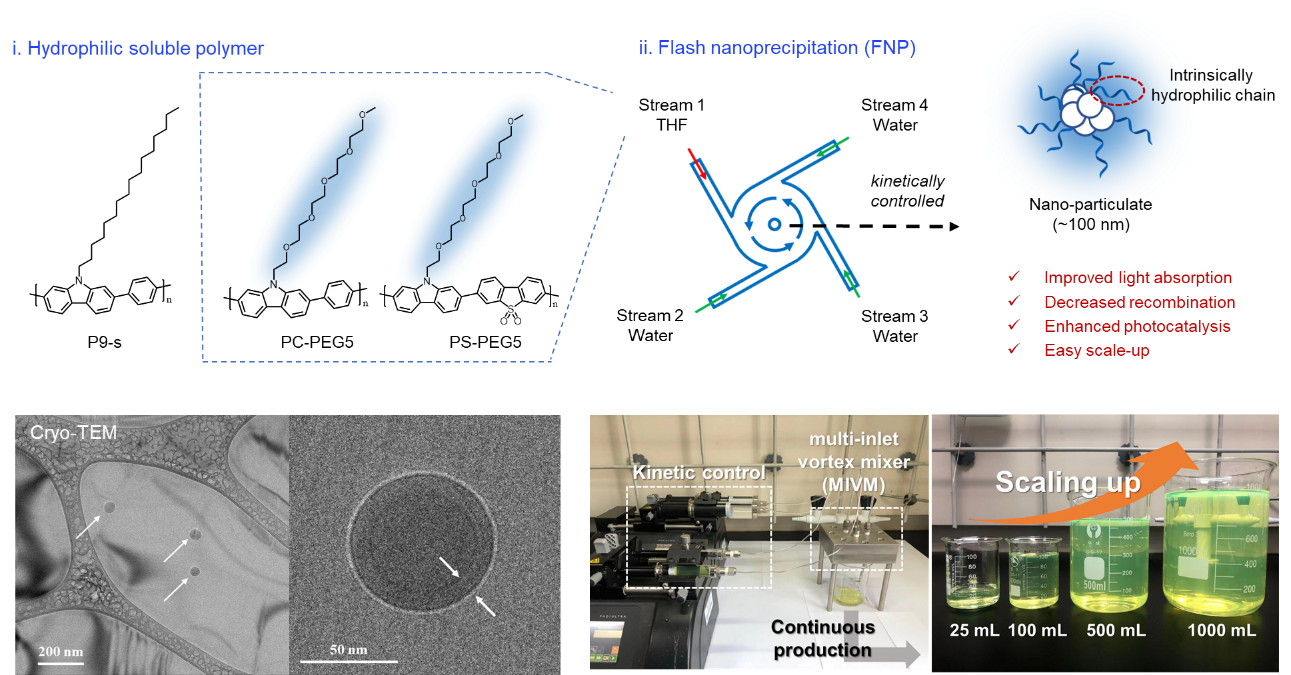 该策略具有非常高的制备重现性,可以进行连续、规模化地生产,为有机光催化剂从实验室小量研究走向实际应用的宏量制备提供了一个有效的方案。研究成果以“Engineering Nanoparticulate Organic Photocatalysts via a Scalable Flash Nanoprecipitation Process for Efficient Hydrogen Production”为题发表于Angew. Chem. Int. Ed. (DOI: 10.1002/anie.202104233)