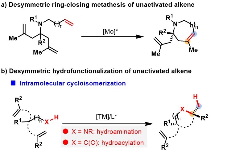 去对称化反应是指含有前手性中心或内消旋化合物在其中一个反应位点选择性官能团化的同时实现对映面识别的过程,是一类合成手性小分子的重要策略。烯烃的不对称转化一直是有机化学研究的核心内容之一。在烯烃的众多反应模式中,去对称化反应是其中一类十分重要的转化方式。目前烯烃的去对称化反应研究进展主要集中于RCM反应或氢官能团化反应。烯烃的去对称化双碳官能团化反应可以在烯烃的两端都引入含碳官能团的同时,构建多个手性中心,能够迅速地增加分子的复杂性,是一类具有吸引力反应模式。