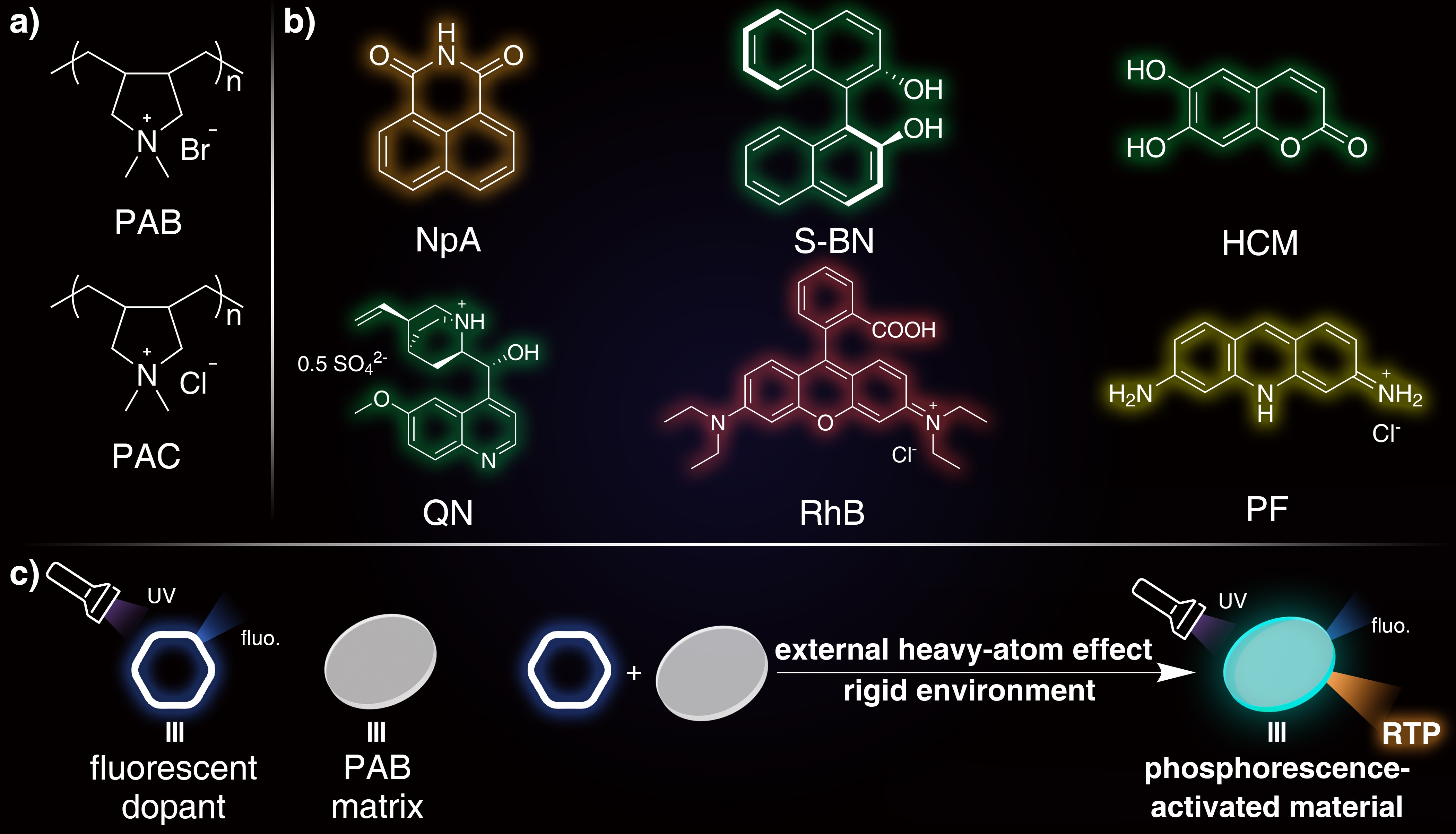 该策略利用了一种具有外部重原子效应和刚性网络的离子型聚合物基质(PAB),构建了一种新型的掺杂RTP体系。PAB具有溴离子,可以在掺入其中的染料受激发后通过外部重原子效应促进其系间窜越(ISC)过程,从而诱导其激发三重态的产生。与此同时,溴阴离子还与聚合物主链上的季胺阳离子形成了刚性的离子键网络,从而抑制了磷光体的非辐射跃迁过程。也就是说,染料激发三重态的产生和稳定都通过同一个聚合物基质实现了,从而诱导了其RTP。同时,本文也证明了这些掺杂材料均处于无定形态,这保证了所得材料的可加工性。本工作不仅为化学和材料科学工作者提供了一种设计磷光材料的便捷手段,也提供了研究三重态的一个有力工具。