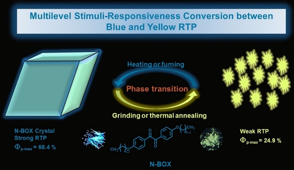 刺激响应性的智能光学材料能对外界刺激,例如光、热、力、酸碱等做出响应,从而实现材料发光性能的变化,在防伪、生物成像、光电子器件中具有重要应用。纯有机室温磷光(RTP)材料相较于荧光材料具有更长的寿命和更大的斯托克斯(Stokes)位移,从而在某些特定的应用场景和领域有其独特的优势。开发出纯有机室温磷光响应的单组分材料体系至关重要,但是,近年来单组分智能室温磷光材料的报道却很少。