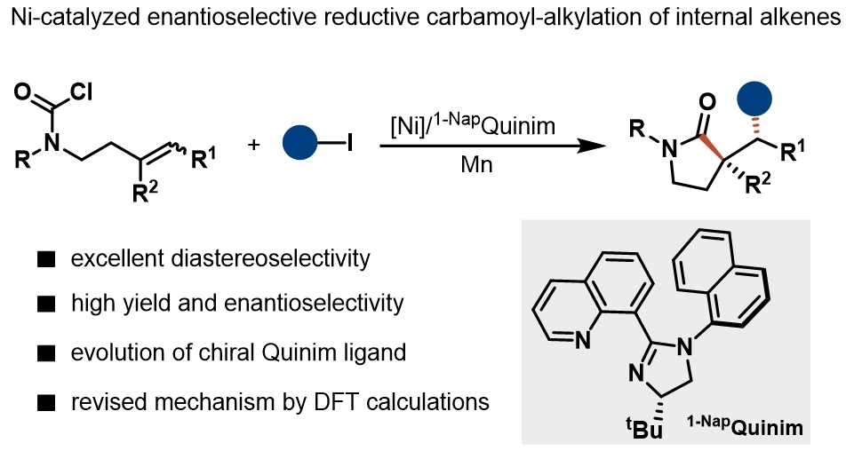 过渡金属催化的胺甲酰基亲电试剂的对映选择性环合反应作为手性内酰胺合成的重要方法之一,近年来得到了化学家们的广泛关注。近日,365英国上市集团官网陈宜峰课题组基于对过渡金属催化的烯烃不对称双官能团化反应构建多重手性中心的研究兴趣,通过对课题组发展的手性8-喹啉咪唑啉为核心骨架Quinim配体的进一步优化,实现了镍催化的内烯不对称胺甲酰基-烷基化反应,为含连续手性中心的γ-内酰胺的便捷式合成提供了一类全新、温和高效的方法。此外,课题组还与加州大学洛杉矶分校 (UCLA)的K. N. Houk课题组合作,对Quinim配体在对映选择性的决定步骤中的作用及反应机理进行了DFT理论计算。理论计算为镍催化还原偶联化学的反应机制以及Quinim手性配体的进一步设计开发提供了理论指导。