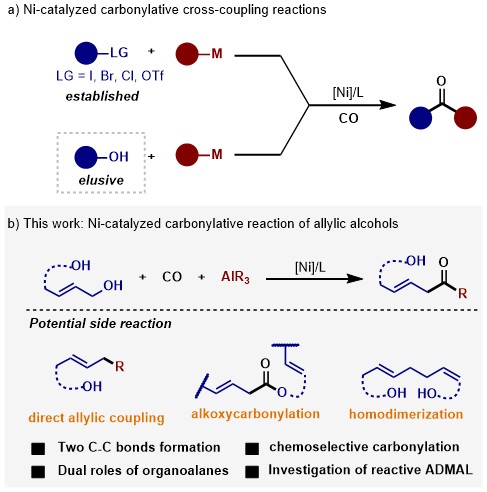 针对这一挑战,365英国上市集团官网陈宜峰课题组基于镍基催化剂能够有效活化C-O键的性质,使用商品化的烷基铝试剂作为亲核试剂,发展了镍催化常压CO下的烯丙醇直接羰化偶联反应,合成了一系列,-不饱和酮类化合物,反应具有较广的底物适用性。这也是首例过渡金属催化的醇作为亲电组分参与羰基化偶联反应生成酮类化合物的例子。有机铝试剂的使用至关重要,其本身较强的亲氧性和路易斯酸性可以有效地活化碳氧键,避免了额外的活化试剂的添加,也能作为碳组分参与偶联组分。利用镍的碳氧键还原消除不利的特性,该反应可以兼容一系列活泼的羟基,如苯酚,苄醇,烷基醇等官能团,实现了烯丙醇的高化学选择性羰基化偶联反应。