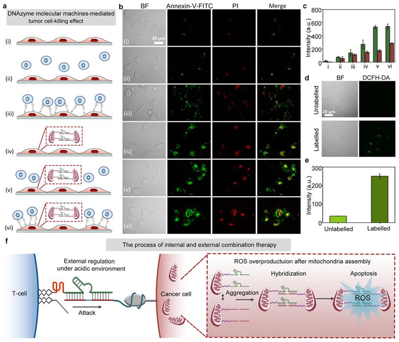 为了克服以上限制,本工作将MUC-1适配体、i-motif结构域、线粒体靶向模块与DNAzyme结构藕连,构建了具备细胞间与细胞内调控功能的DNAzyme分子机器,可分别从细胞外与细胞内对肿瘤细胞进行靶向杀伤。在细胞外,本策略可实现T细胞与肿瘤细胞间的动态调控,包括肿瘤细胞识别、T细胞-肿瘤细胞密接以及肿瘤杀伤后的T细胞解离。在乏锌肿瘤细胞内,DNAzyme分子机器可诱导线粒体聚集,产生ROS并促进肿瘤细胞凋亡。在酸性环境下,凋亡荧光成像实验证明基于DNAzyme分子机器的肿瘤复合治疗策略对乏锌PANC-1细胞的杀伤效果显著。