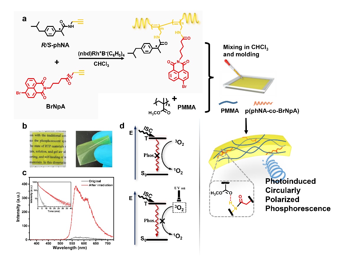 因此,研究团队设计合成了含有溴萘酰亚胺的非手性取代炔单体(BrNpA),随后与手性炔单体(R/S-phNA)发生共聚反应获得具有潜在磷光发射的手性螺旋取代聚乙炔。通过与聚甲基丙烯酸甲酯的简单塑模过程获得了具有圆偏振磷光发射的柔性薄膜。取代聚乙炔的手性螺旋结构表现显著的光学活性,赋予材料较高的圆偏振发光不对称因子,最高高达0.019(glum)。薄膜在紫外光照射下的耗氧特性赋予材料动态手性光学功能,可以通过紫外光调控圆偏振磷光发射,具有非接触、抗疲劳的显著优势。此外,通过改变取代聚乙炔内部组成,在控制氧气渗透率的基础上,实现圆偏振磷光的可编程保留时间,这有助于该体系成为刺激可控手性器件的重要候选材料。