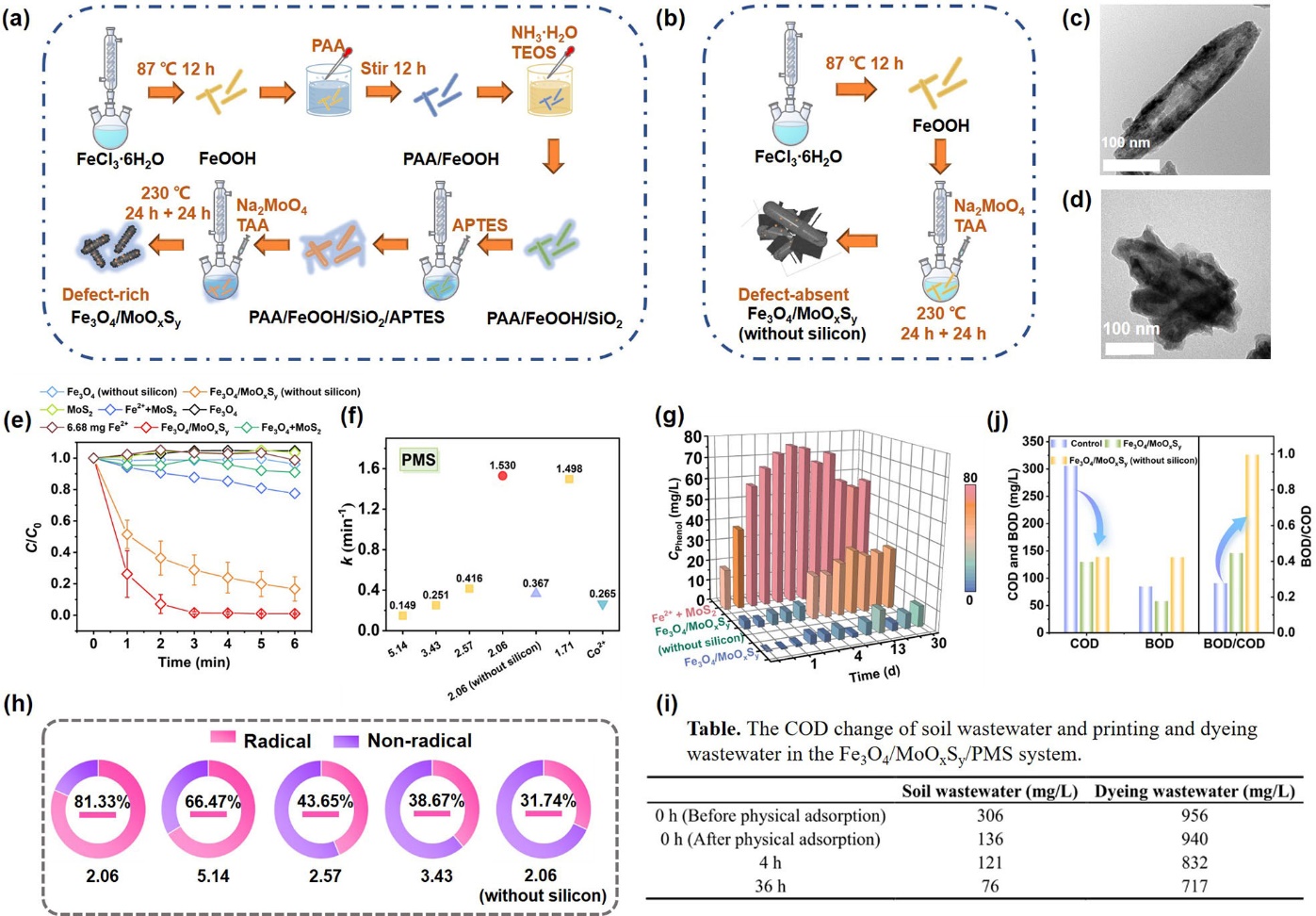 然而,精准设计类芬顿催化剂活性位点和开发具有可调控的催化氧化途径是目前的研究难点。为解决上述难题,365英国上市集团官网邢明阳教授团队通过引入缺陷和调节催化剂表面的Mo4+/Mo6+比例,在Fe3O4/MoOxSy活化过一硫酸氢盐(PMS)降解苯酚的体系中实现了自由基和非自由基反应途径的切换。采用分步热还原法制备了Fe3O4/MoOxSy类芬顿催化剂(表面包硅修饰,图a;不包硅修饰,图b),并在微观形貌(包硅,图c;不包硅,图d)、晶体结构、化学性质、催化活性(图e)等方面将两种催化剂进行了比较。包硅操作会破坏Fe3O4和MoOxSy的表面晶格,引入表面缺陷。丰富的缺陷电子使得催化剂表面暴露更多的Mo4+,进一步促进了PMS活化分解产生自由基,最大反应k值可达1.530 min-1(图f),且还能实现对苯酚长达30天的长效降解(图g)。实验证实包硅改性可使得自由基反应历程主导降解苯酚的贡献率达到81.33%(图h)。同时,改变钼铁比会提高催化剂表面暴露Mo6+的比例。Mo6+有助于产生1O2,因此,随着Mo6+占比的提高可实现从自由基向非自由基反应历程的切换,且非自由基主导的降解苯酚的贡献率可达68.26%(图h)。自由基反应历程主导的类芬顿体系可实现对实际有机废水化学需氧量(COD)的高效去除(图i);而非自由基反应历程主导的体系则可显著提高废水的可生化性(BOD/COD = 0.997)(图j)。Fe3O4/MoOxSy/PMS类芬顿体系中自由基与非自由基反应历程的切换,拓展了高级氧化技术在废水处理中的靶向应用。