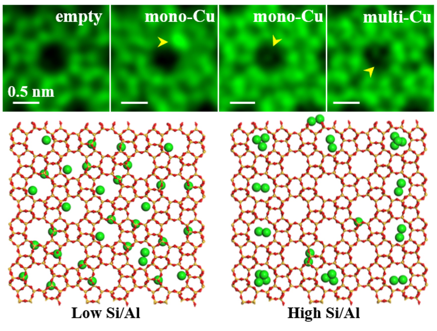 Cu基分子筛催化剂被广泛应用于氨选择性催化净化、NO/N2O直接解离、甲烷直接氧化制甲醇等多种催化反应。在原子尺度准确识别分子筛孔道中Cu物种结构,明确Cu物种构型与反应性能之间的构效关系,对于发展性能更为优异的Cu基分子筛催化剂具有重要意义。然而,电子束对分子筛骨架的辐照损伤阻碍了Cu基分子筛材料本征结构的电子显微成像,长期以来缺乏原子尺度的实空间证据,导致了大量关于负载Cu的尺寸、落位、构型等的争议问题。