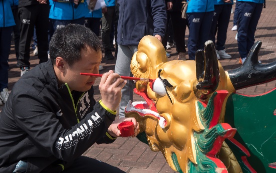 经化学学院工会精心策划、组织,有148名教职工报名参赛,另有啦啦队员15名,组成8支参赛队。上午9时,学院院长曲大辉教授讲话并宣布龙舟赛开幕。在大家的鼓掌声中,学院党委书记张文清教授和院长曲大辉教授为龙头点睛,预祝龙舟赛取得圆满成功,学院发展红红火火!