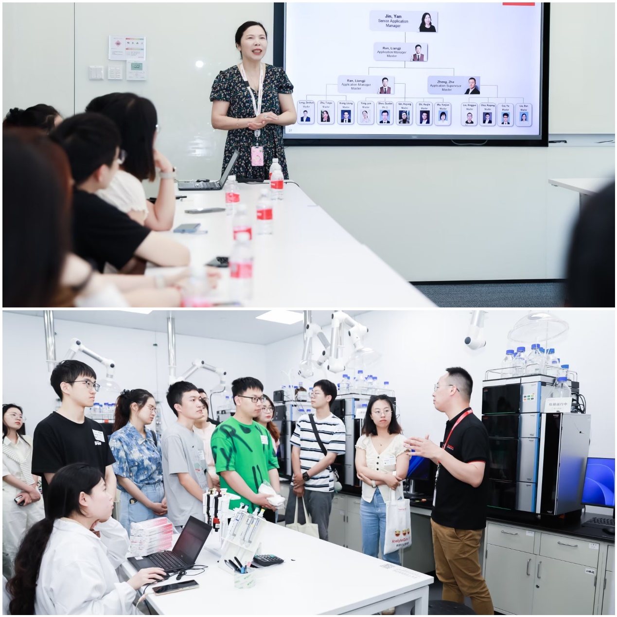 首先,赛默飞色谱质谱事业部HPCS 高级经理金燕介绍了赛默飞进入中国40年以来取得的非凡成就与客户体验中心的概况。HPLC高级应用工程师沈国滨为师生介绍了色谱质谱部相关情况,带领同学们参观了高分辨质谱仪、高效液相色谱等先进的科研设备和仪器,让大家了解了赛默飞世尔公司在科学研究、仪器设备研发和技术应用方面的重要成果。