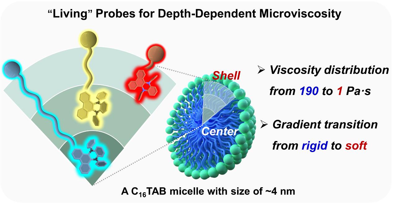 聚集体的微观性质是非常具有挑战性的研究课题,比如胶束内部的微粘度 仍存在着诸多争议。基于不同的测试方法,部分观点认为球形胶束内部是液态, 而另一部分观点则认为是固态。理论计算已经证明球形胶束内部的碳原子密度从 核中心到壳层是逐级降低的,因此可以预期球形胶束内部的微粘度也是从核中心 的高粘度逐步降低到壳层附近的低粘度,然而目前还没有实验对这种梯度变化进行定量验证。一个重要的原因可能是没有合适的分子探针工具。因此,基于新的 检测机制,开发合适的工具用以探究胶束内部与深度相关的粘度成为十分迫切的 需求。