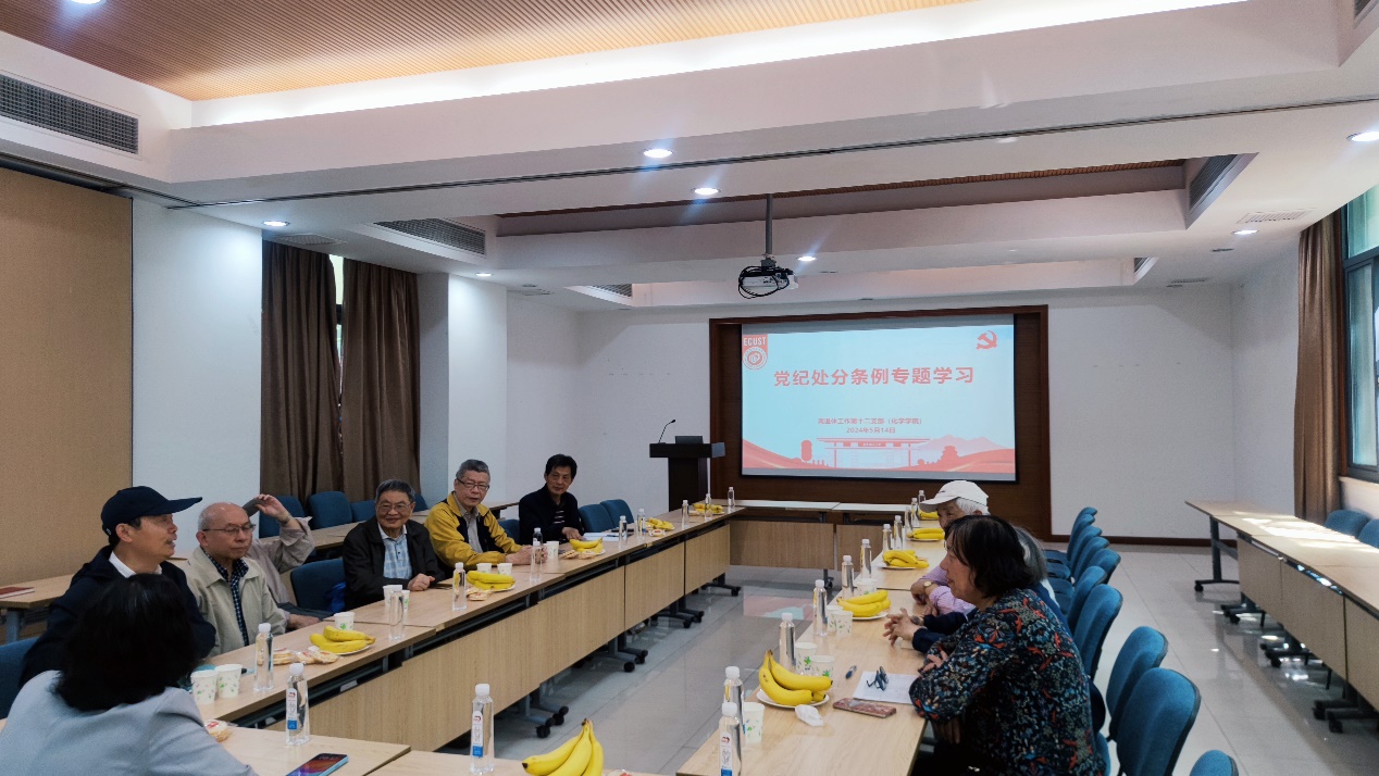 为深入推进党纪学习教育走深走实,5月14日上午,化学学院离退休教师党支部组织开展了党纪学习教育,对《中国共产党纪律处分条例》等相关内容进行深入学习和研讨交流。学院党委书记张文清,离退休工作第12党支部(化学学院离退休教师党支部)书记虞大红、学院离退休工作联络员周佳玮及退休教师党员共同参加了活动。