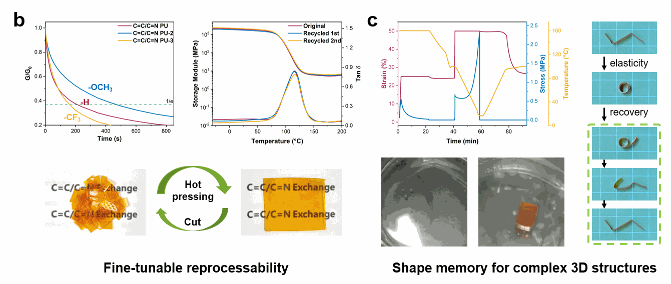 C=C/C=N交换反应赋予该材料显著的网络重构能力,在相同温度下,其特征应力松弛时间仅为C=N PU对照组的1/20左右。因此,这类材料可以通过热压进行多次回收再加工,同时保持其化学完整性、热性能和机械性能。进一步,研究人员发现通过改变动态键邻位的取代基,可以对材料应力松弛速度(吸电子基加快、推电子基减慢)进行高效调控。最后,研究人员探索了这类材料的形状记忆功能,将其在高温段(~150 °C)进行快速键交换以重构其3D永久网络,从而具备复杂的初始几何形状;在中温段(~90 °C)达到玻璃化转变温度后进行链段运动,从而获得弹性以编辑其临时形状;快速降至室温固定临时形状后重新升温(如浸入热水)则可引发快速形状记忆(< 3 s)过程。综上所述,本工作首次将C=C/C=N交换反应应用于聚合网络,构筑了一类无催化剂、可再加工、可形状记忆且具备优异机械性能的共价自适应网络智能材料,为无催化剂CANs智能材料的发展提供了新的思路。