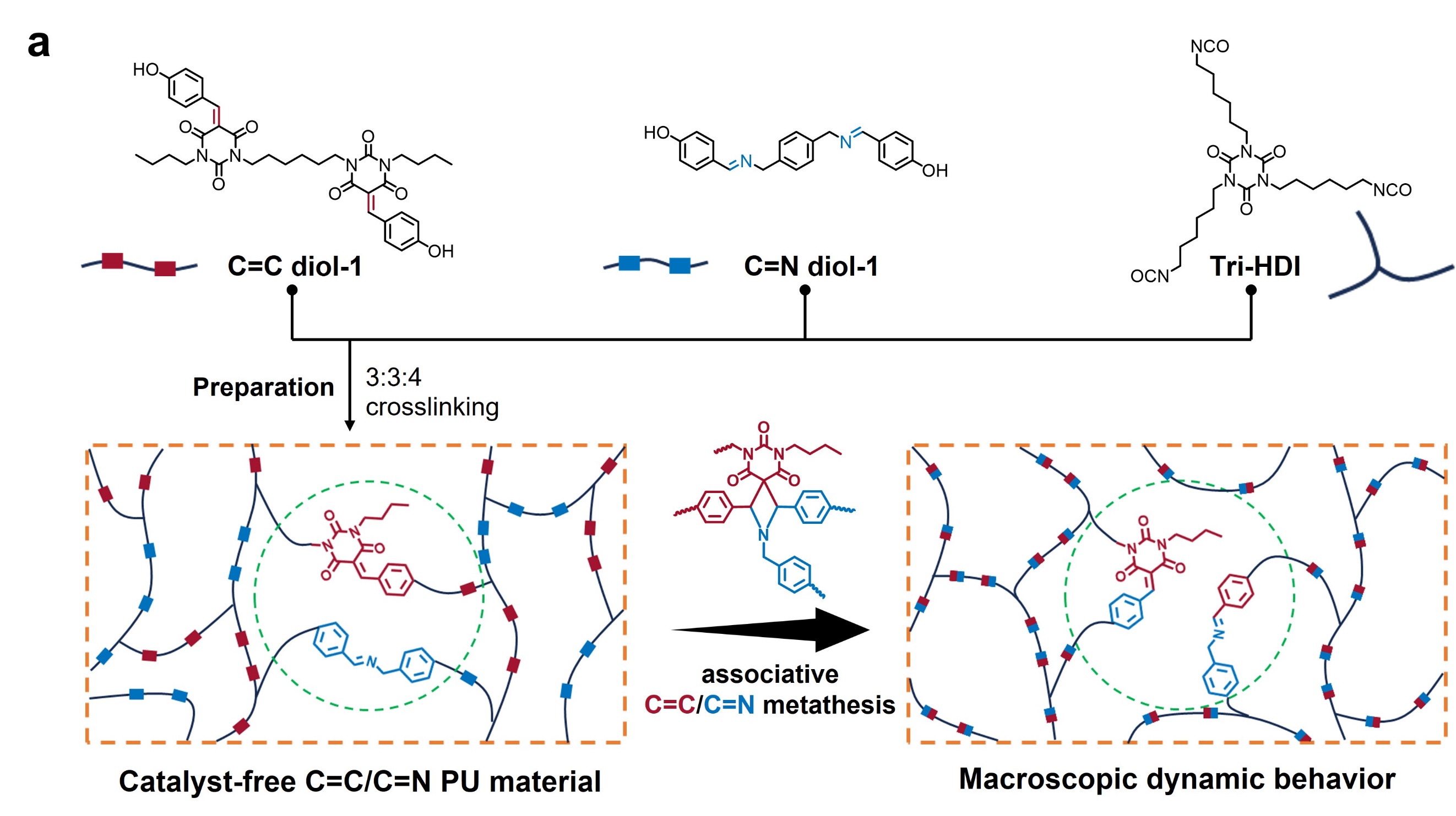 为了解决上述问题,团队人员在聚氨酯材料骨架中创新引入无需催化剂的C=C/C=N动态共价交换反应,通过C=C键(Knoevenagel缩合产物)与C=N键(亚胺化合物)在无催化剂条件下的动态交换赋予材料动态性能。团队首先设计合成了含有C=C、C=N键的二羟基化合物(C=C diol-1与C=N diol-1),并将其与市售的六亚甲基二异氰酸酯(Tri-HDI)交联获得了含有C=C/C=N复分解基元的热固性聚氨酯(C=C/C=N PU)。所得C=C/C=N PU具有优异的热/力学性能(Tg:83 °C,拉伸强度:63.0 ± 2.5 MPa,杨氏模量:1512 ± 259 MPa, 断裂伸长率:7.5 ± 0.9%)、稳定性(Td5%:307 °C)以及耐溶剂性,可媲美普遍应用的热固性树脂材料。